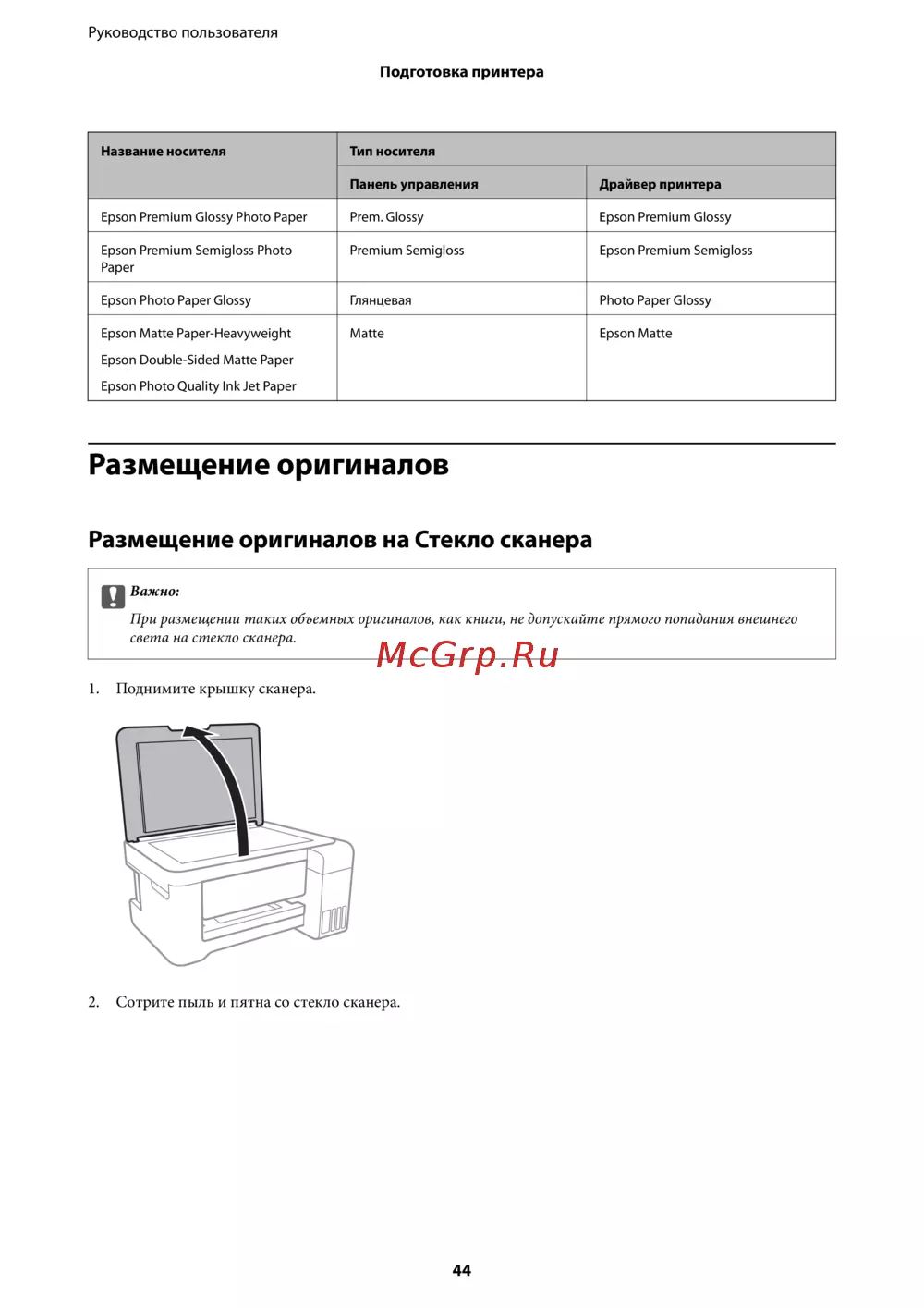 При размещении таких объемных оригиналов, как книги, не допускайте прямого попадания внешнего