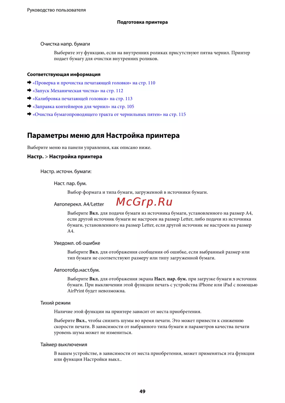 & «Очистка бумагопроводящего тракта от чернильных пятен» на стр. 115