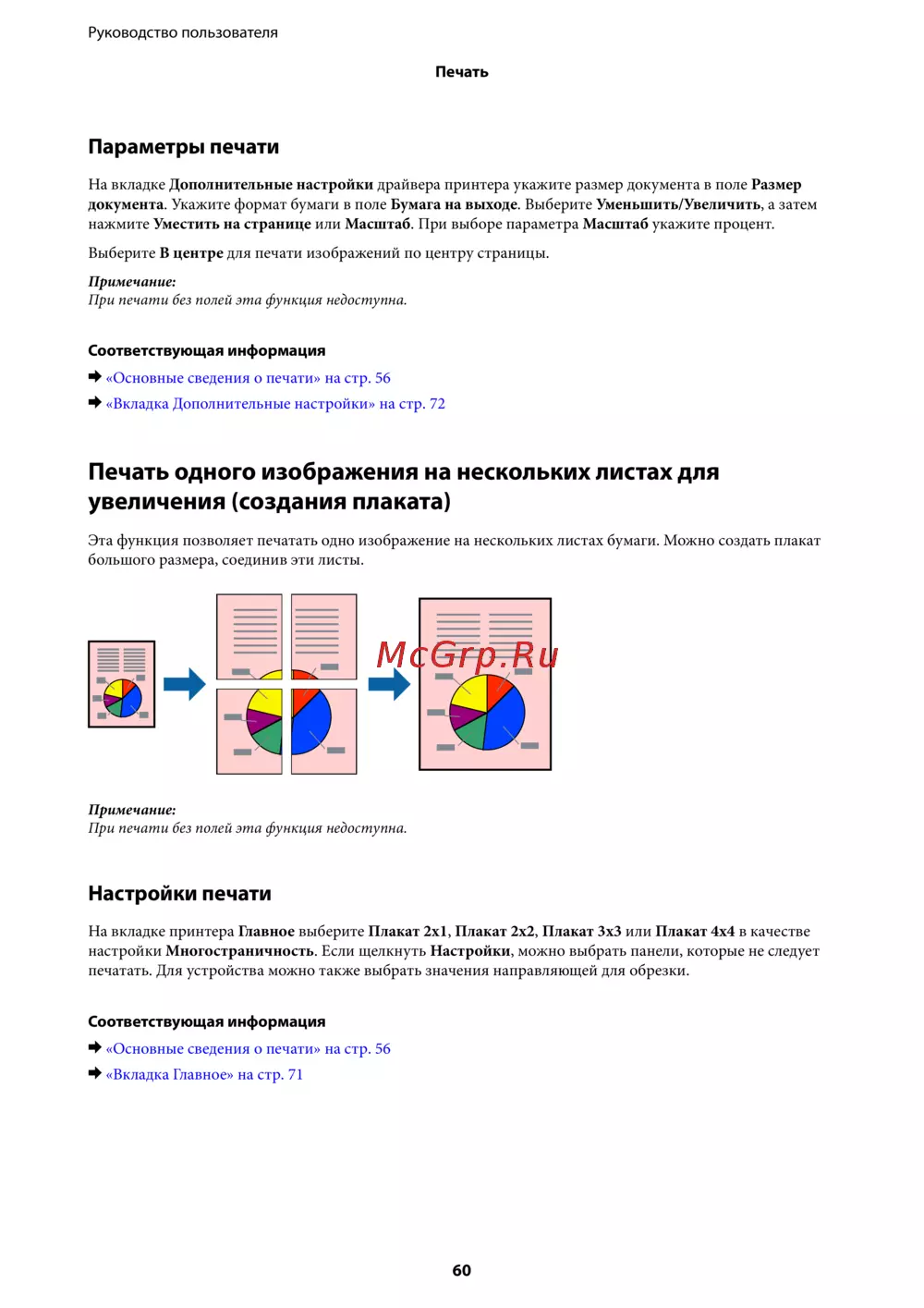 Эта функция позволяет печатать одно изображение на нескольких листах бумаги. Можно создать плакат