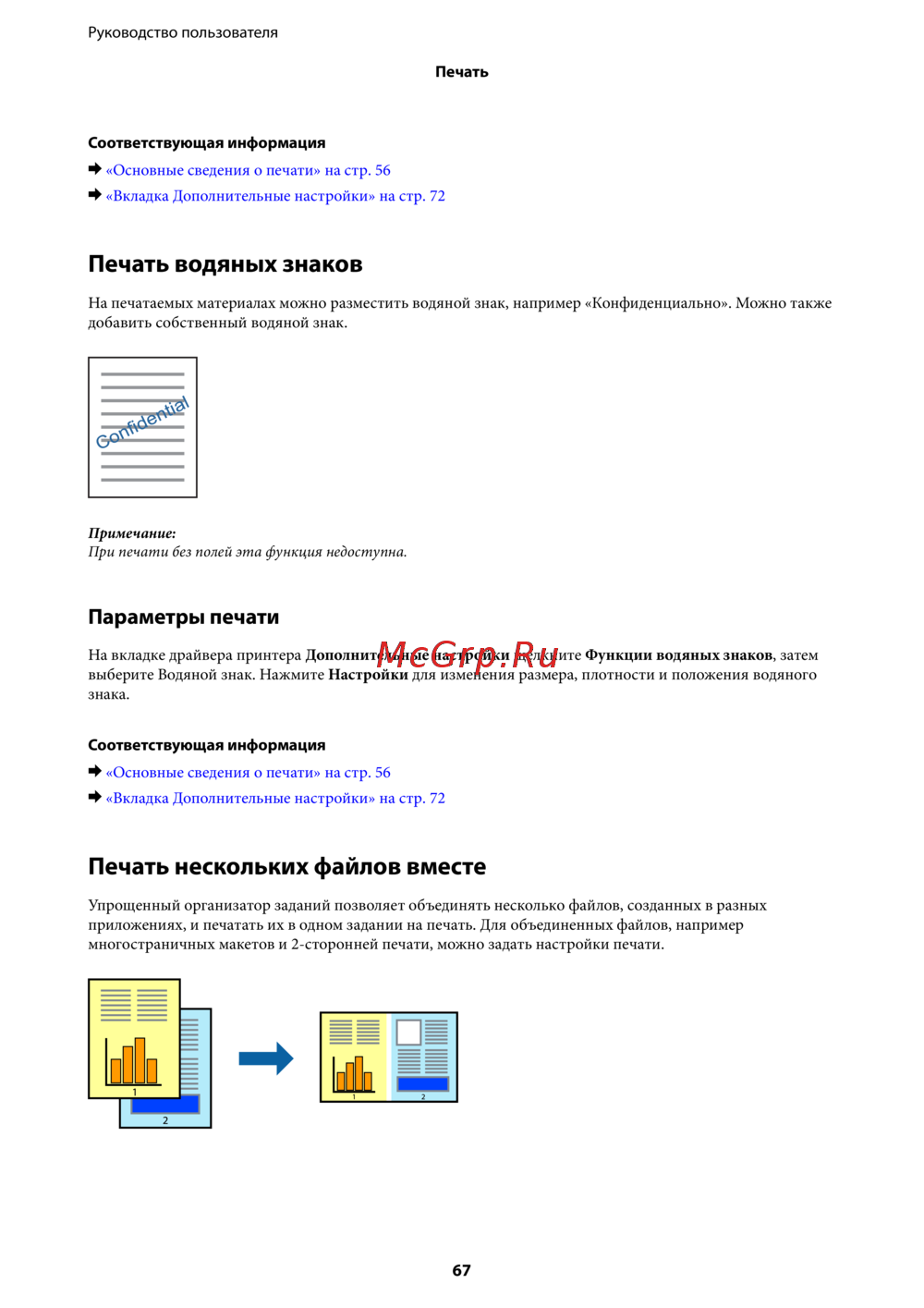 Узнайте, как использовать водяные знаки и объединять файлы для печати. Настройте параметры печати для достижения наилучших результатов. Читайте больше в руководстве.