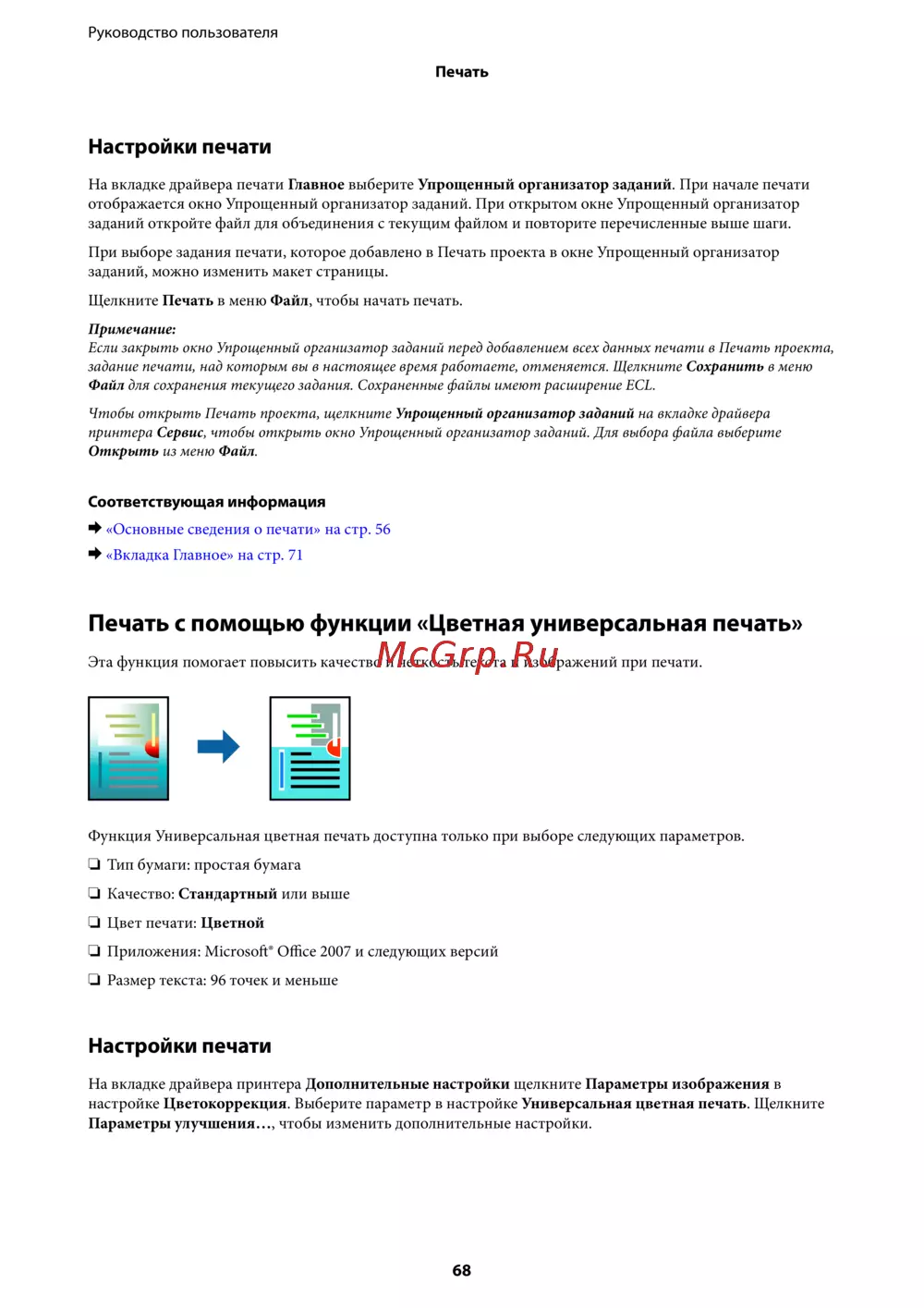 Узнайте, как настроить печать с помощью упрощенного организатора заданий и улучшить качество печати с помощью универсальной цветной печати. Подробные инструкции.
