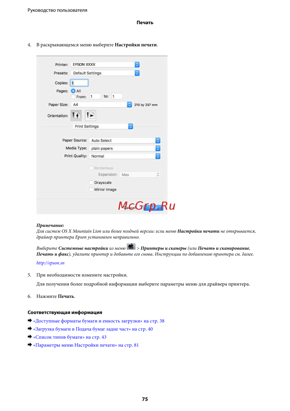 Для систем OS X Mountain Lion или более поздней версии: если меню Настройки печати не открывается,