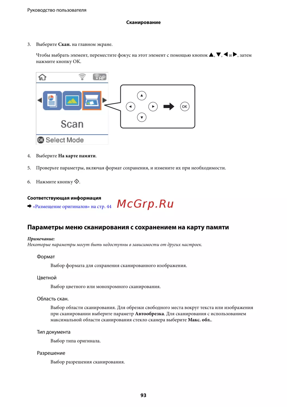 Узнайте, как выбрать параметры сканирования, включая формат, цвет и разрешение. Следуйте простым шагам для сохранения изображений на карту памяти.
