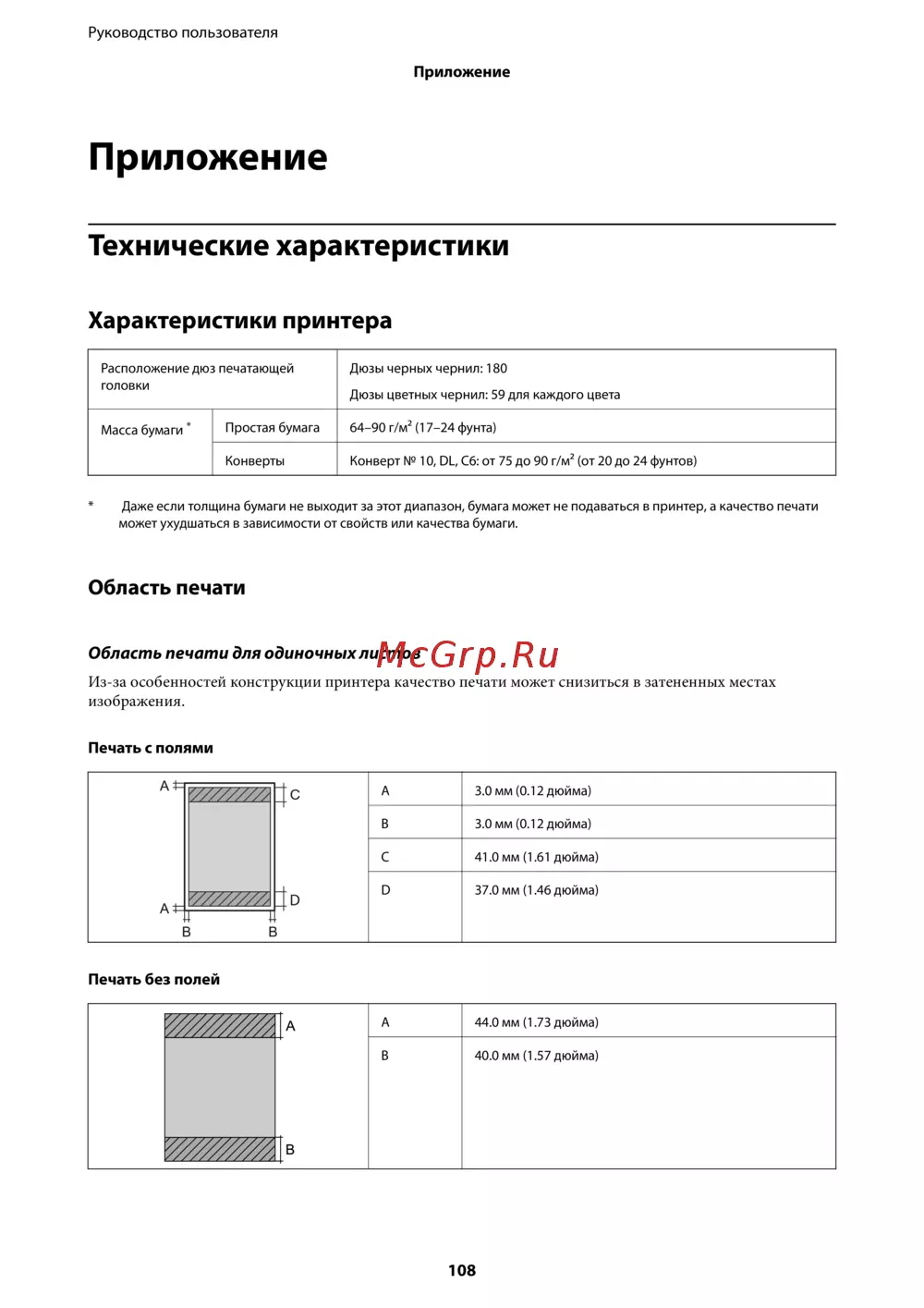Epson L3101 — технические характеристики принтера: дюзы, масса бумаги и область печати [108/122]