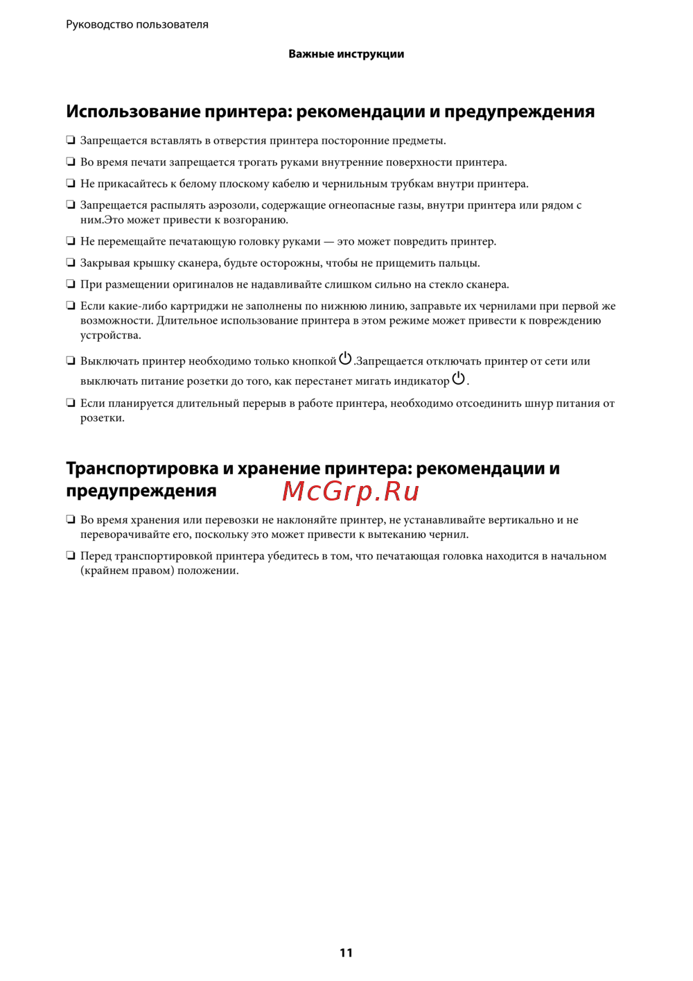 - Транспортировка и хранение принтера рекомендации и предупреждения p.11