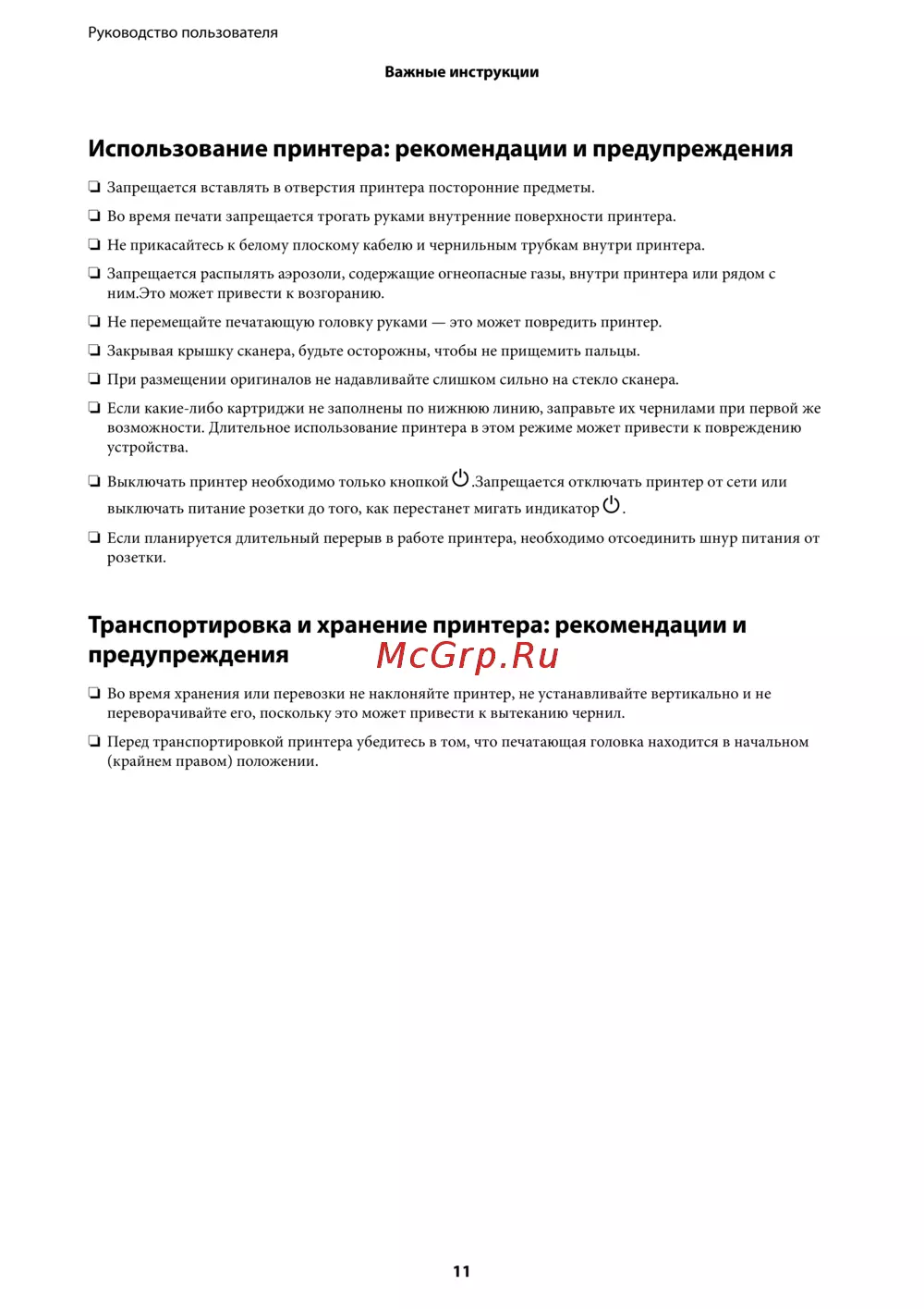 Epson L3101 — рекомендации по безопасному использованию принтера и его транспортировке [11/122]