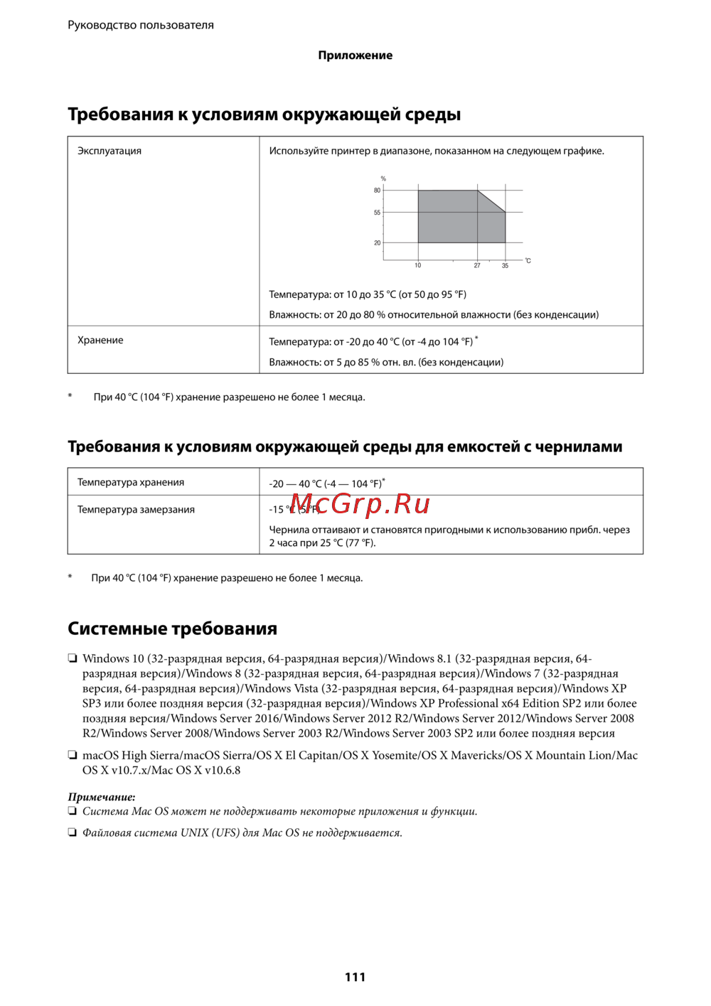 - Требования к условиям окружающей среды для емкостей с чернилами p.111