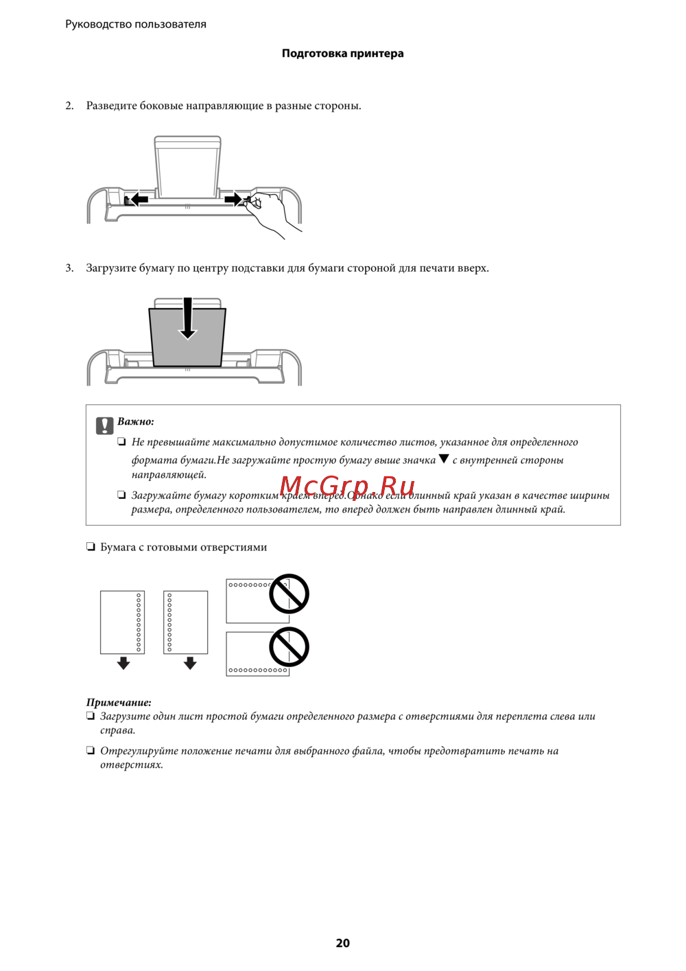 - Загрузите бумагу по центру подставки для бумаги стороной для печати вверх p.20