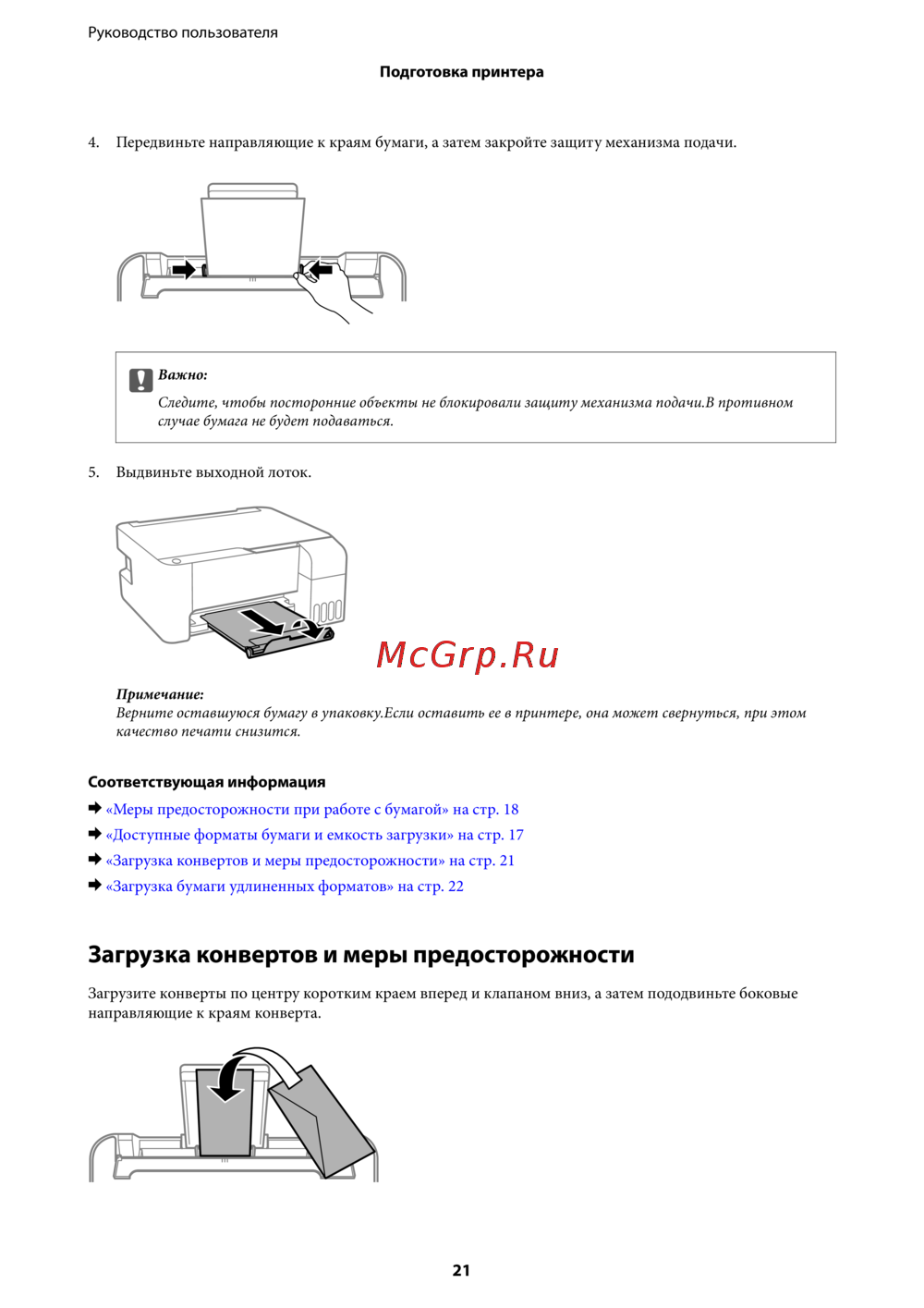 - Загрузка конвертов и меры предосторожности p.21