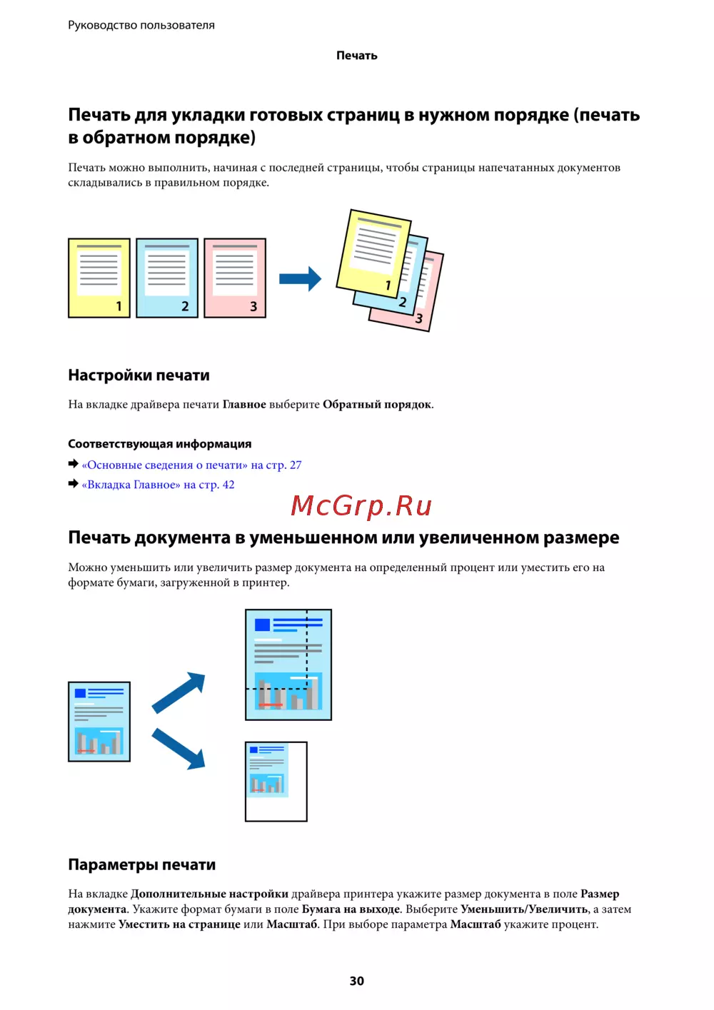 Печать можно выполнить, начиная с последней страницы, чтобы страницы напечатанных документов