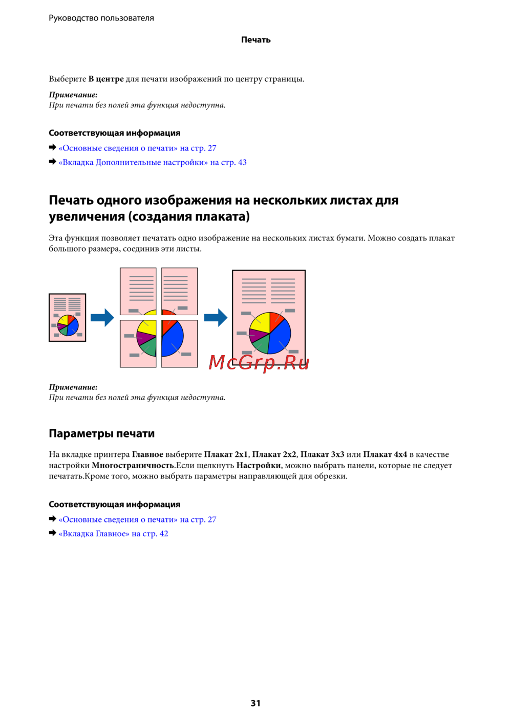 Эта функция позволяет печатать одно изображение на нескольких листах бумаги. Можно создать плакат