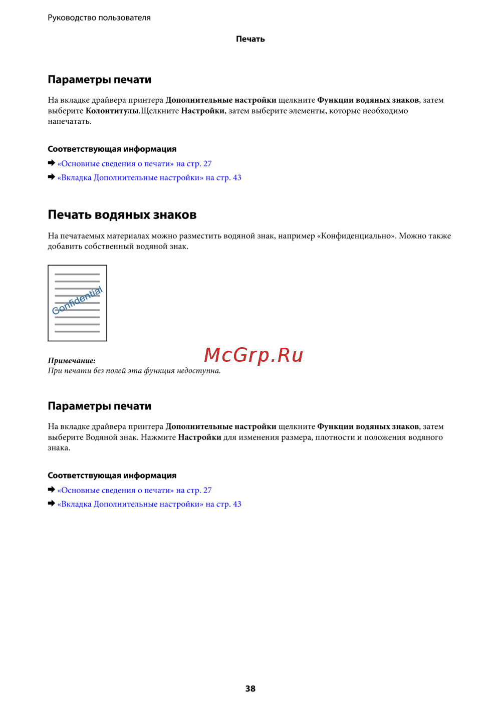 На печатаемых материалах можно разместить водяной знак, например «Конфиденциально». Можно также