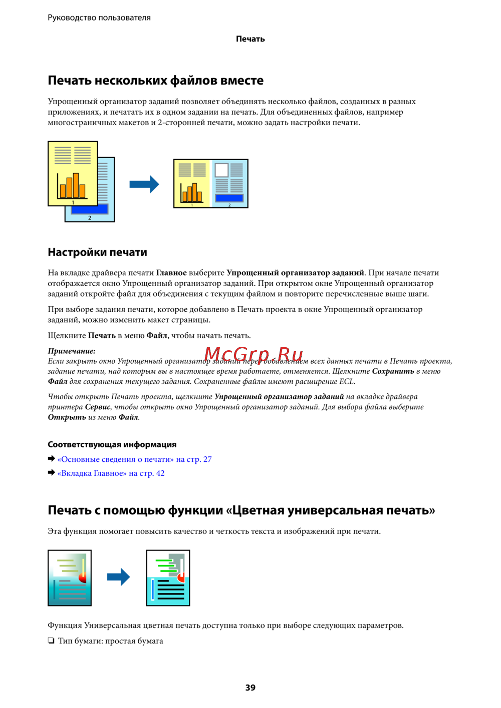 Узнайте, как использовать Упрощенный организатор заданий для объединения и печати нескольких файлов. Настройте параметры печати для многостраничных документов и двусторонней печати.