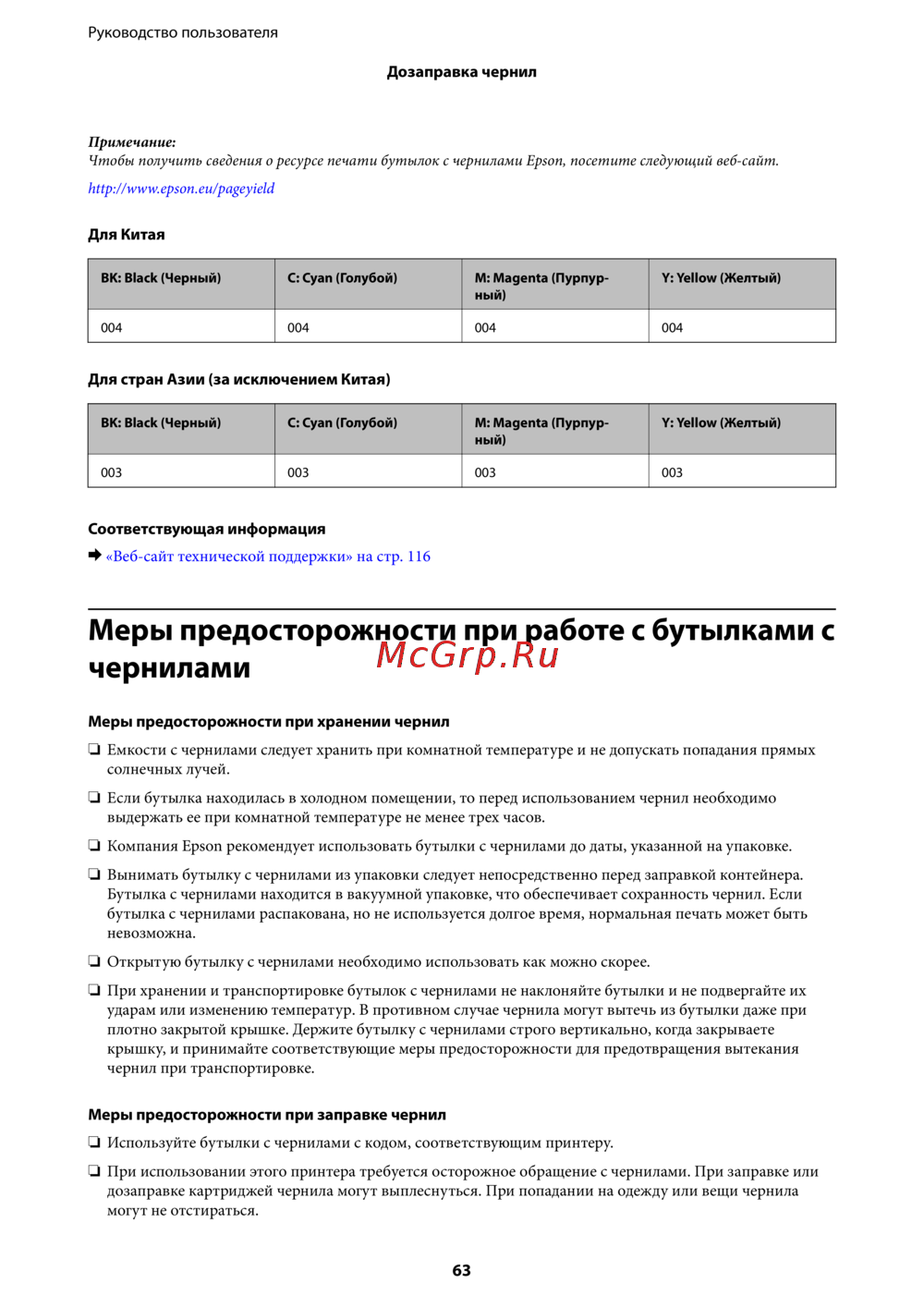 Чтобы получить сведения о ресурсе печати бутылок с чернилами Epson, посетите следующий веб-сайт.