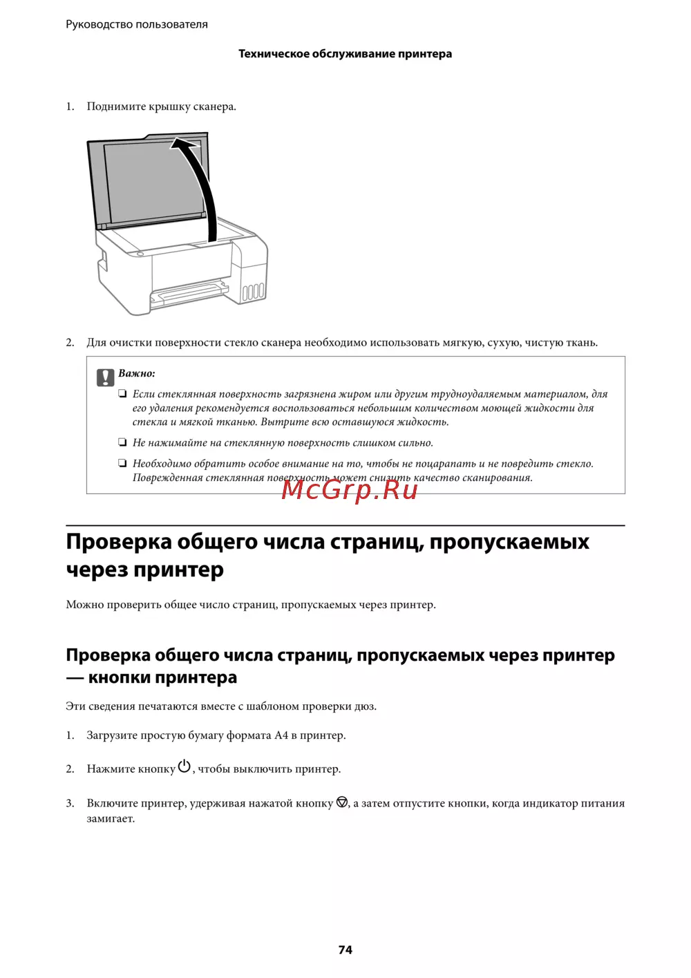 Узнайте, как правильно очищать стекло сканера и проверять общее количество страниц, пропускаемых через принтер. Следуйте простым шагам для поддержания качества.
