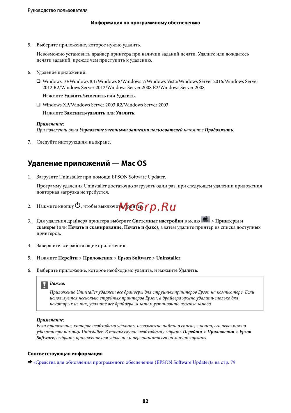 удалить при помощи Uninstaller. В таком случае необходимо выбрать Перейти > Приложения > Epson