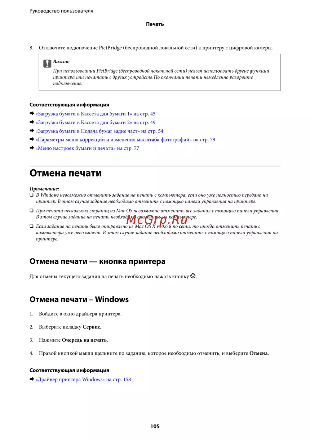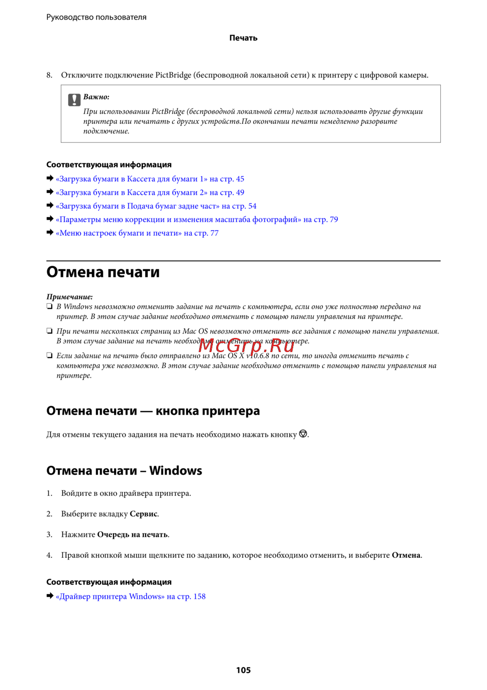 ❏ В Windows невозможно отменить задание на печать с компьютера, если оно уже полностью передано на