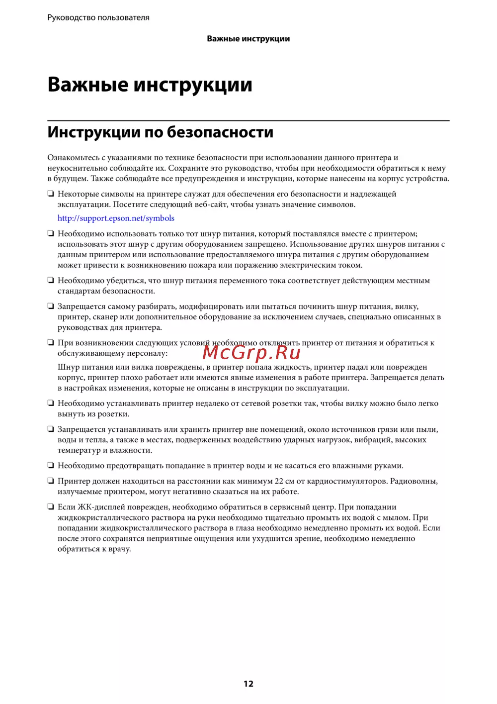 Ознакомьтесь с важными инструкциями по безопасности при использовании принтера. Соблюдайте указания для предотвращения несчастных случаев и повреждений.