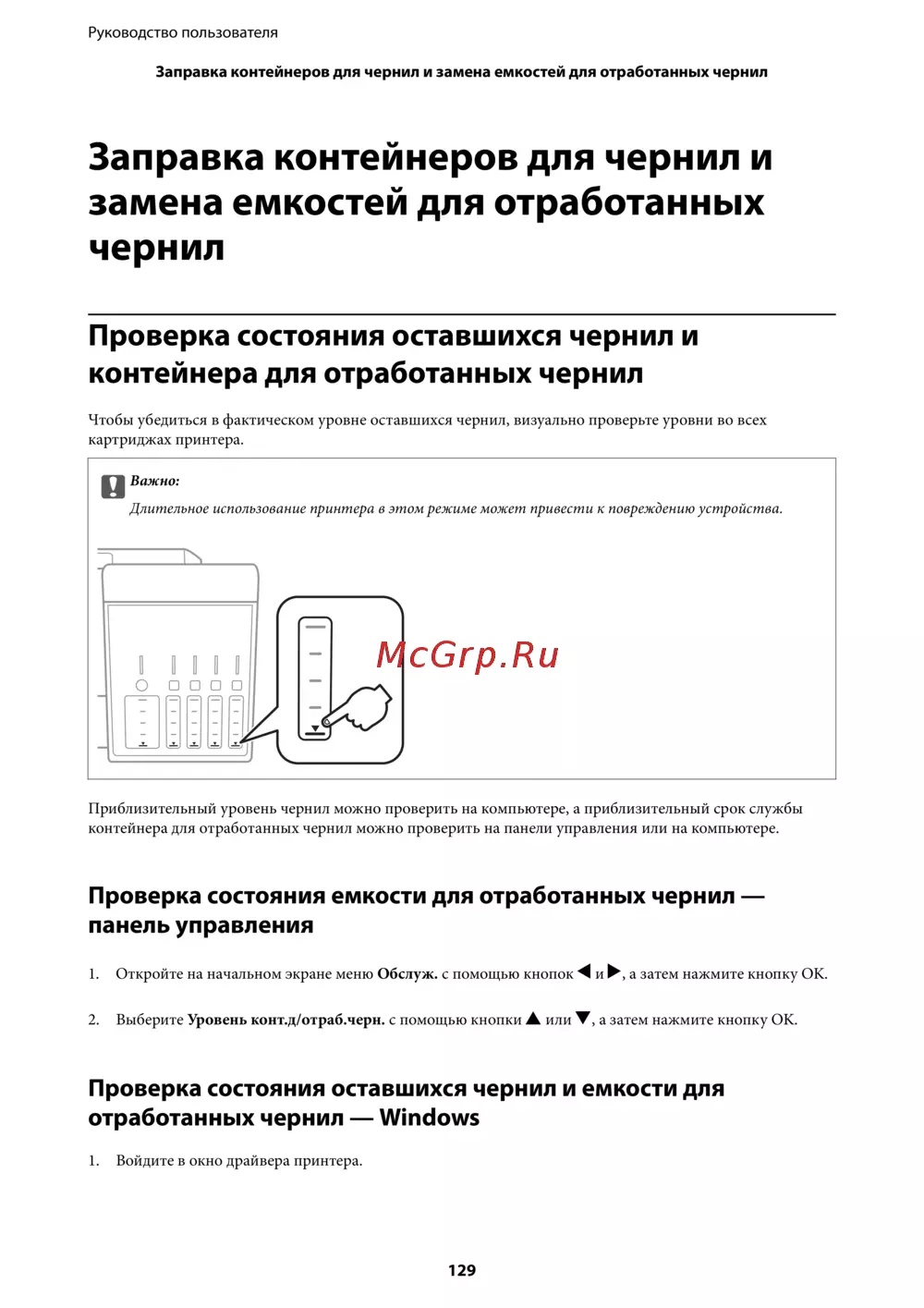 контейнера для отработанных чернил можно проверить на панели управления или на компьютере.