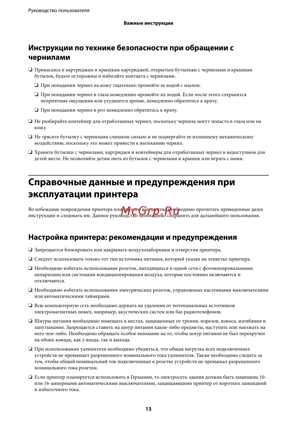 - Инструкции по технике безопасности при обращении с чернилами p.13