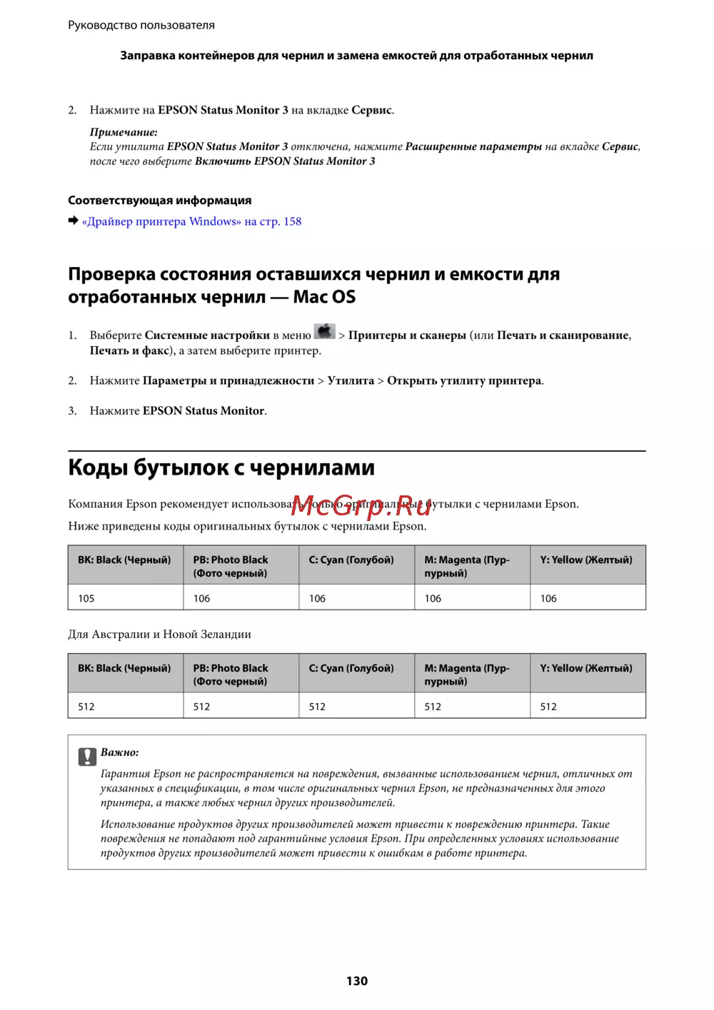 Гарантия Epson не распространяется на повреждения, вызванные использованием чернил, отличных от
