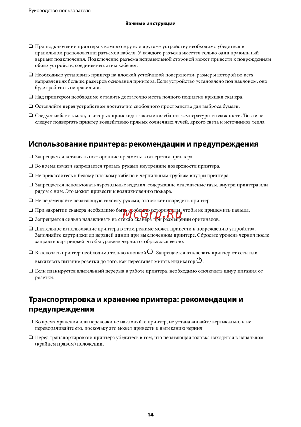 - Использование принтера рекомендации и предупреждения p.14