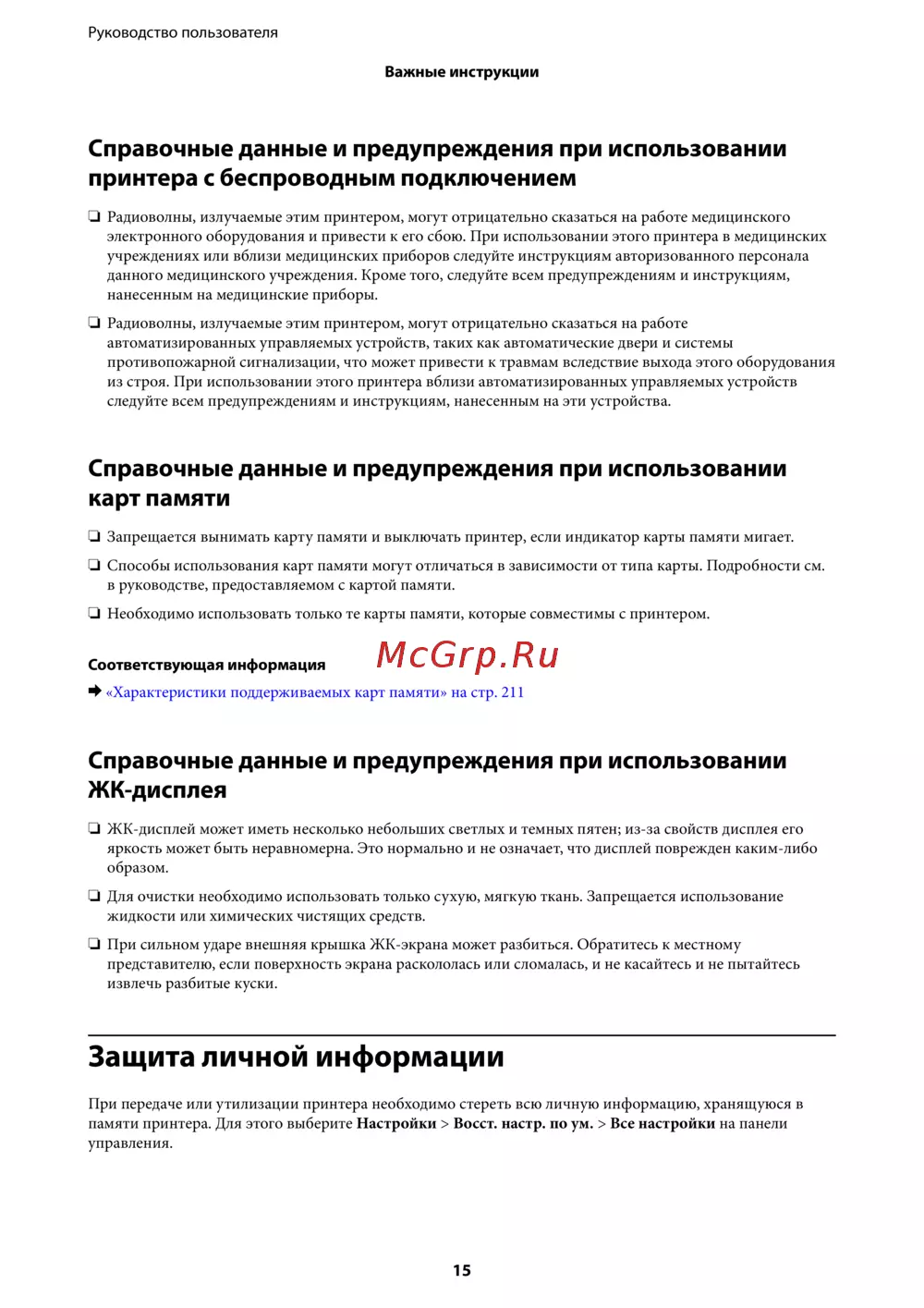 Epson L7180 — предупреждения и рекомендации по использованию беспроводного принтера [15/222]