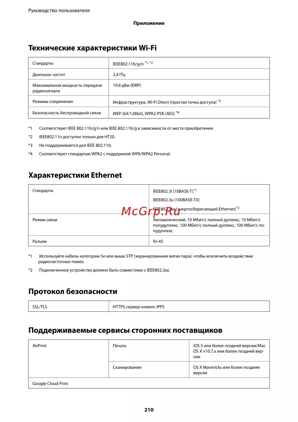 Epson L7180 — технические характеристики Wi-Fi и Ethernet для сетевых устройств [210/222]