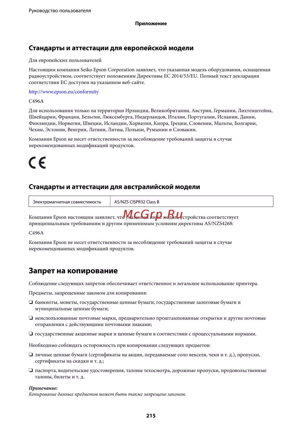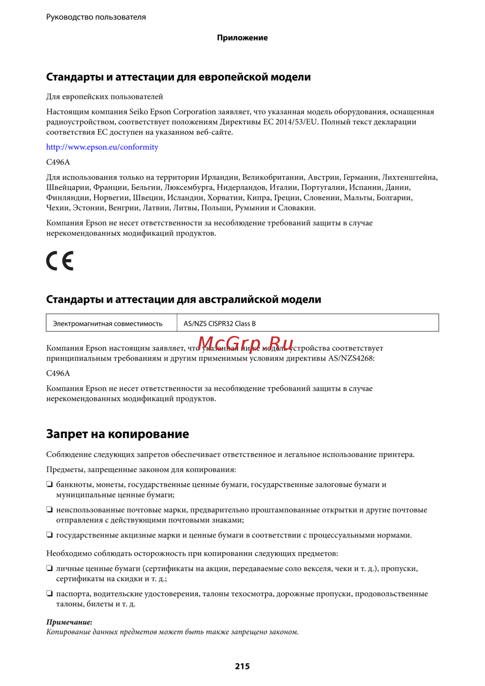 Узнайте о стандартах и аттестациях для моделей оборудования в Европе и Австралии. Соблюдайте правила использования и избегайте запрещенных копий.