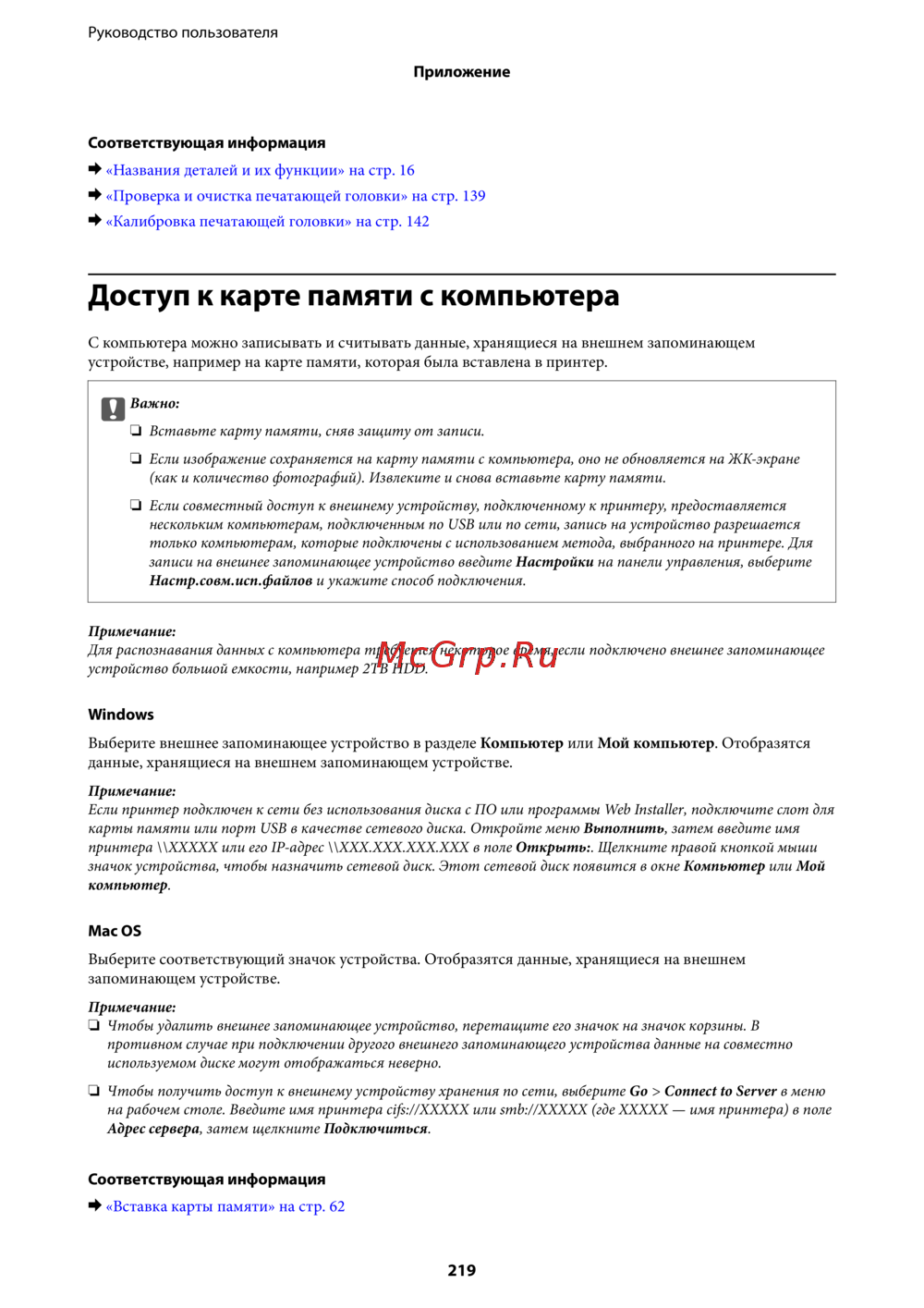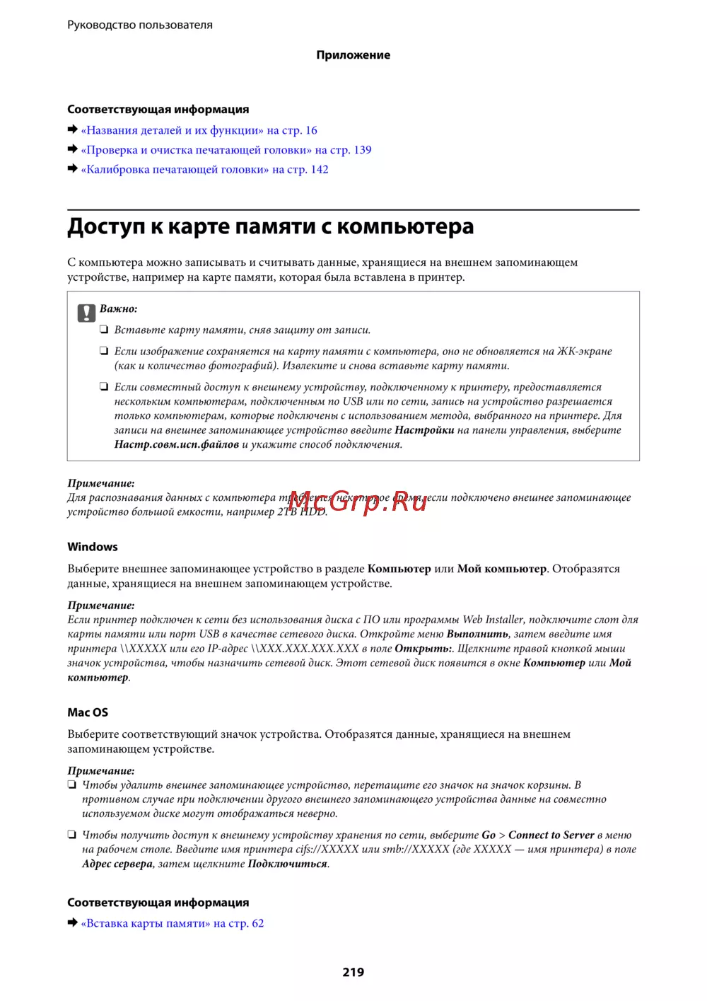 - С компьютера можно записывать и считывать данные хранящиеся на внешнем запоминающем устройстве например на карте памяти которая была вставлена в принтер p.219
