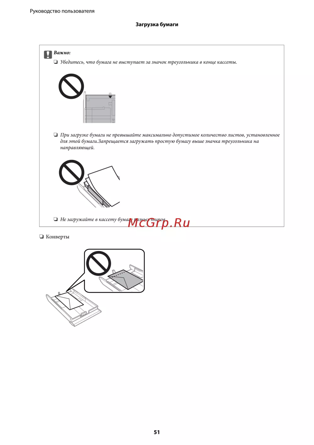 ❏ При загрузке бумаги не превышайте максимально допустимое количество листов, установленное