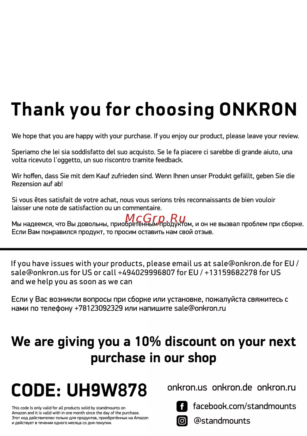 Thank you for choosing ONKRON We hope that you are happy with your purchase If you enjoy our product please leave your review Speriamo ehe lei sia soddisfatto del suo acquisto Se le fa piacere ci sarebbe di grande aiuto una volta ricevuto l oggetto un suo riscontro tramite feedback Wir hoffen dass Sie mit dem Kauf zufrieden sind Wenn Ihnen unser Produkt gefällt geben Sie die Rezension auf ab Si vous êtes satisfait de votre achat nous vous serions très reconnaissants de bien vouloir laisser une note de satisfaction ou un commentaire Мы надеемся что Вы довольны приобретённым продуктом и он не вызвал проблем при сборке Если Вам понравился продукт то просим оставить нам свой отзыв If you have issues with your products please email us at sale onkron de for EU sale onkron us for US or call 494029996807 for EU 13159682278 for US and we help you as soon as we can Если у Вас возникли вопросы при сборке или установке пожалуйста свяжитесь с нами по телефону 78123092329 или напишите sale onkron ru We are giving you a 10 discount on your next purchase in our shop CODE UH9W878 This code Is only valid for ad products solid by standmounts on Amazon and it is valid with in one month since the day of the purchase Этот код действителен только для продуктов приобретённых на Amazon и действует в течении одного месяца со дня покупки onkron us onkron de onkron ru Q facebook com standmounts standmounts