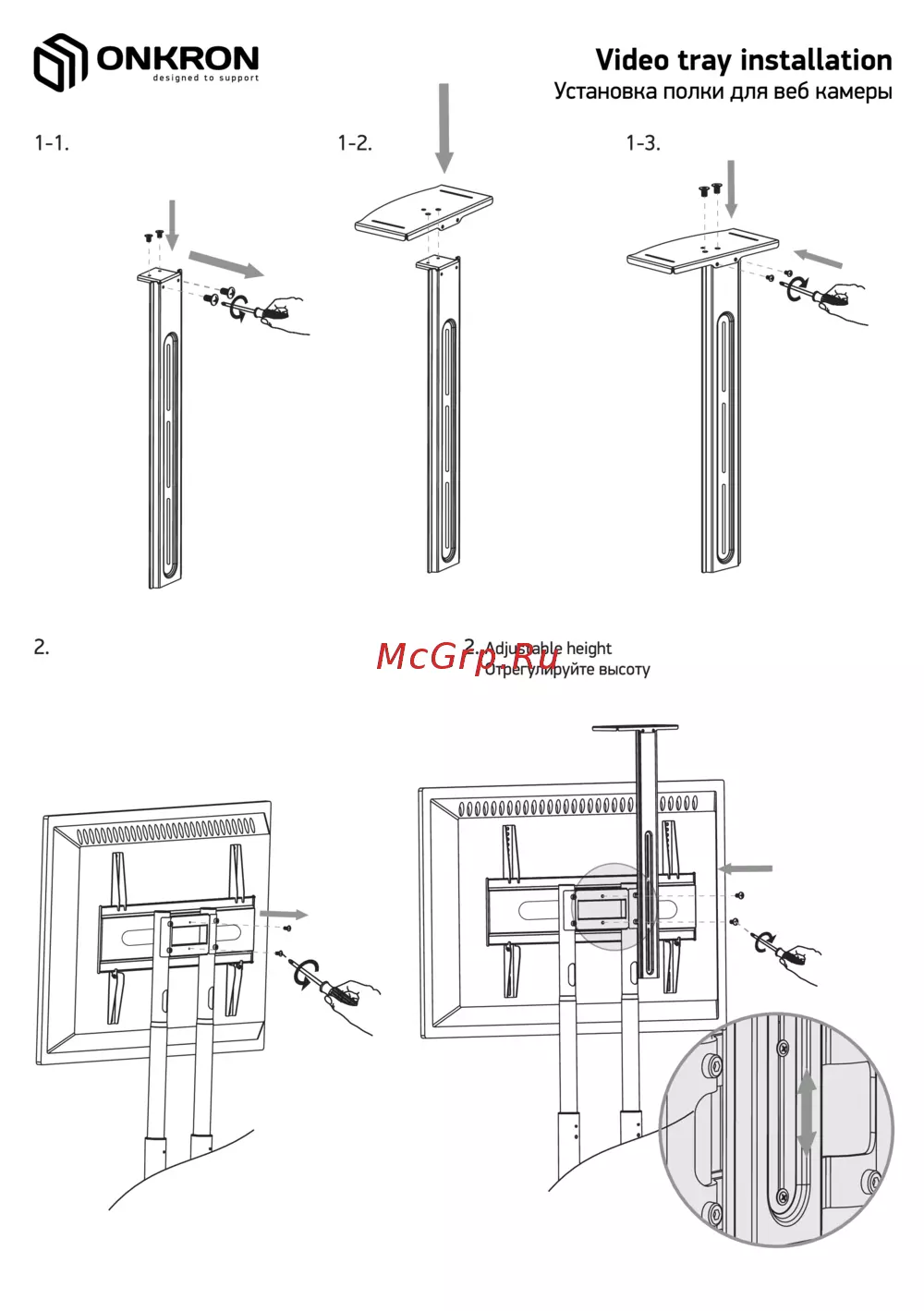ONKRON Video tray installation Установка полки для веб камеры 1 3 2 Adjustable height Отрегулируйте высоту OOCCOOflOOOOCOOOOflOOOOP