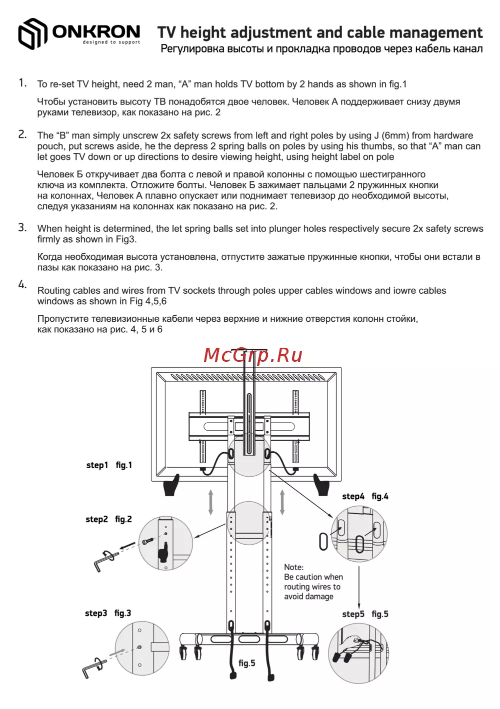 ONKRON I IF designed to support TV height adjustment and cable management Регулировка высоты и прокладка проводов через кабель канал 1 То re set TV height need 2 man A man holds TV bottom by 2 hands as shown in fig 1 Чтобы установить высоту ТВ понадобятся двое человек Человек А поддерживает снизу двумя руками телевизор как показано на рис 2 2 The В man simply unscrew 2х safety screws from left and right poles by using J 6mm from hardware pouch put screws aside he the depress 2 spring balls on poles by using his thumbs so that A man can let goes TV down or up directions to desire viewing height using height label on pole Человек Б откручивает два болта с левой и правой колонны с помощью шестигранного ключа из комплекта Отложите болты Человек Б зажимает пальцами 2 пружинных кнопки на колоннах Человек А плавно опускает или поднимает телевизор до необходимой высоты следуя указаниям на колоннах как показано на рис 2 3 When height is determined the let spring balls set into plunger holes respectively secure 2x safety screws firmly as shown in Fig3 Когда необходимая высота установлена отпустите зажатые пружинные кнопки чтобы они встали в пазы как показано на рис 3 4 Routing cables and wires from TV sockets through poles upper cables windows and iowre cables windows as shown in Fig 4 5 6 Пропустите телевизионные кабели через верхние и нижние отверстия колонн стойки как показано на рис 4 5 и 6 step3 fig 3