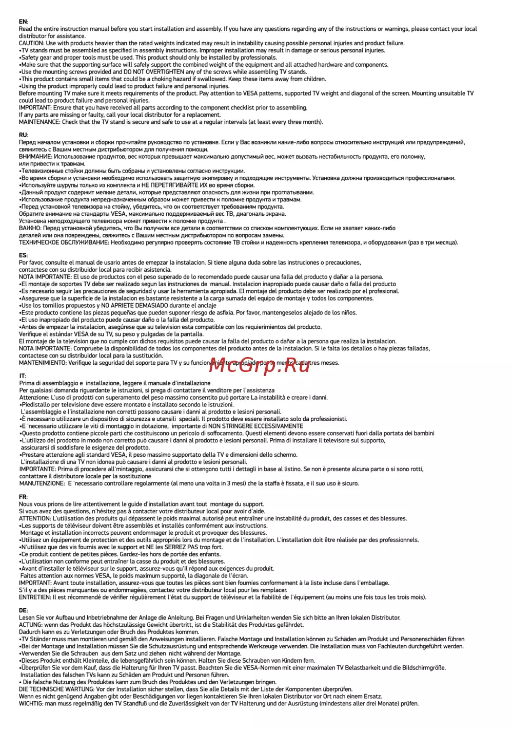 EN Read the entire instruction manual before you start installation and assembly If you have any questions regarding any of the instructions or warnings please contact your local distributor for assistance CAUTION Use with products heavier than the rated weights indicated may result in instability causing possible personal injuries and product failure TV stands must be assembled as specified in assembly instructions Improper installation may result in damage or serious personal injuries Safety gear and proper tools must be used This product should only be installed by professionals Make sure that the supporting surface will safely support the combined weight of the equipment and all attached hardware and components Use the mounting screws provided and DO NOT OVERTIGHTEN any of the screws while assembling TV stands This product contains small items that could be a choking hazard if swallowed Keep these items away from children Using the product improperly could lead to product failure and personal injuries Before mounting TV make sure it meets requirements of the product Pay attention to VESA patterns supported TV weight and diagonal of the screen Mounting unsuitable TV could lead to product failure and personal injuries IMPORTANT Ensure that you have received all parts according to the component checklist prior to assembling If any parts are missing or faulty call your local distributor for a replacement MAINTENANCE Check that the TV stand is secure and safe to use at a regular intervals at least every three month RU Перед началом установки и сборки прочитайте руководство по установке Если у Вас возникли какие либо вопросы относительно инструкций или предупреждений свяжитесь с Вашим местным дистрибьютором для получения помощи ВНИМАНИЕ Использование продуктов вес которых превышает максимально допустимый вес может вызвать нестабильность продукта его поломку или привести к травмам Телевизионные стойки должны быть собраны и установлены согласно инструкции Во время сборки и установки необходимо использовать защитную экипировку и подходящие инструменты Установка должна производиться профессионалами Используйте шурупы только из комплекта и НЕ ПЕРЕТЯГИВАЙТЕ ИХ во время сборки Данный продукт содержит мелкие детали которые представляют опасность для жизни при проглатывании Использование продукта непредназначенным образом может привести к поломке продукта и травмам Перед установкой телевизора на стойку убедитесь что он соответствует требованиям продукта Обратите внимание на стандарты VESA максимально поддерживаемый вес ТВ диагональ экрана Установка неподходящего телевизора может привести к поломке продукта ВАЖНО Перед установкой убедитесь что Вы получили все детали в соответствии со списком комплектующих Если не хватает каких либо деталей или она повреждены свяжитесь с Вашим местным дистрибьютором по вопросам замены ТЕХНИЧЕСКОЕ ОБСЛУЖИВАНИЕ Необходимо регулярно проверять состояние ТВ стойки и надежность крепления телевизора и оборудования раз в три месяца ES Por favor consulte el manual de usario antes de emepzar la instalación Si tiene alguna duda sobre las instruciones o precauciones contactase con su distribuidor local para recibir asistencia NOTA IMPORTANTE El uso de productos con el peso superado de lo recomendado puede causar una falla del producto y dañar a la persona El montaje de soportes TV debe ser realizado según las instruciones de manual Instalación inapropiado puede causar daño o falla del producto Es necesario seguir las precauciones de seguridad y usar la herramienta apropiada El montaje del producto debe ser realizado por el profesional Asegúrese que la superficie de la instalación es bastante resistente a la carga sumada del equipo de montaje y todos los componentes Use los tornillos propuestos y NO APRIETE DEMASIADO durante el anclaje Este producto contiene las piezas pequeñas que pueden suponer riesgo de asfixia Por favor mantengeselos alejado de los niños El uso inapropiado del producto puede causar daño o la falla del producto Antes de empezar la instalación asegúrese que su television esta compatible con los requierimientos del producto Verifique el estándar VESA de su TV su peso y pulgadas de la pantalla El montaje de la television que no cumple con dichos requisitos puede causar la falla del producto o dañar a la persona que realiza la instalación NOTA IMPORTANTE Compruebe la disponibilidad de todos los componentes del producto antes de la instalación Si le falta los detallos o hay piezas falladas contactase con su distribuidor local para la sustitución MANTENIMIENTO Verifique la seguridad del soporte para TV y su funcionamiento apropiado por lo menos cada tres meses IT Prima di assemblaggio e installazione leggere