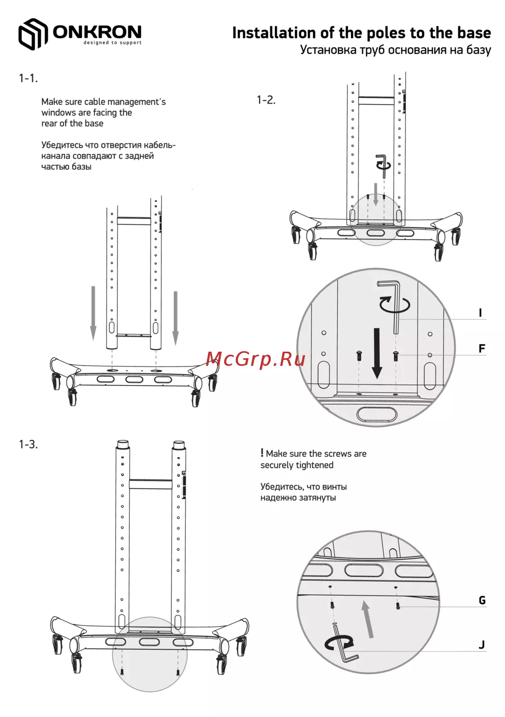 ONKRON designed to support Installation of the poles to the base Установка труб основания на базу 1 1 Make sure cable management s windows are facing the rear of the base Убедитесь что отверстия кабельканала совпадают с задней частью базы Make sure the screws are securely tightened Убедитесь что винты надежно затянуты