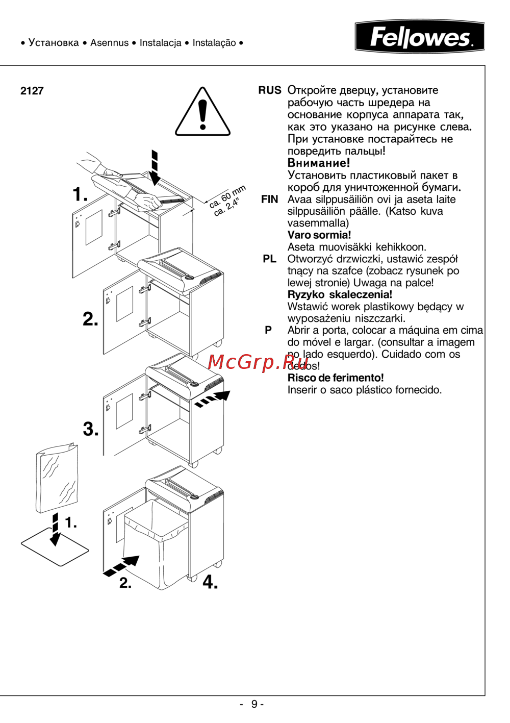 - Îòêðîéòå äâåðöó óñòàíîâèòå ðàáî óþ àñòü øðåäåðà íà îñíîâàíèå êîðïóñà àïïàðàòà òàê êàê ýòî óêàçàíî íà ðèñóíêå ñëåâà ïðè óñòàíîâêå ïîñòàðàéòåñü íå ïîâðåäèòü ïàëüöû âíèìàíèå âíèìàíèå âíèìàíèå âíèìàíèå âíèìàíèå óñòàíîâèòü ïëàñòèêîâûé ïàêåò â êîðîá äëÿ óíè òîæåííîé áóìàãè p.9