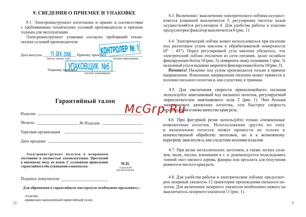 9 СВЕДЕНИЯ О ПРИЕМКЕ И УПАКОВКЕ 9 1 Электроинструмент изготовлен и принят в соответствии с требованиями технических условий производителя и признан годным для эксплуатации Электроинструмент упакован согласно требований техни ческих условий производителя _______ ШТРОЛЕНЧ ПЕК Ж_ Приемку произвел Дата выпуска _ ЦЕП15 UUD число месяц год штамп приемщика i________ __ у УПАКОВЩИК 6 штамп упаковщика Упаковку произвел 4 3 Включение выключение электрического лобзика осущест вляется клавишей выключателя 5 регулировка частоты ходов осуществляйтся регулятором 4 Для удобства работы в изделии предусмотрен фиксатор выключателя 6 рис 1 4 4 Электрический лобзик может использоваться при пилении под различным углом наклона к обрабатываемой поверхности 0 45 Перед регулировкой угла наклона убедитесь что электричский лобзик отключен из сети питания далее ослабьте фиксирующие болты 10 рис 3 поверните лыжу основание 1 рис 3 на нужный угол и надежно закрепите фиксирующие болты 10 рис 3 Помните Пиление под углом производится только в прямом направлении Изменение направления пиления может привести к поломке пильного полотна и как следствие к травмам 4 5 Для увеличения скорости прямолинейного пиления используйте маятниковый ход пильного полотна регулируемый переключателем маятникового хода 2 рис 1 Чем больше маятниковое движение полотна тем быстрее скорость прохождения и ниже качество края реза Гарантийный талон Изделие _____________________________________________________ Дата продажи ________________________________________________ 4 6 При фигурной резке используйте только специальные ножовочные полотна Использование других по типу и назначению полотен может привести не только к некачественной обработке заготовок но и к возможному перегреву двигателя и как следствие поломке изделия Электроинструмент получен в исправном состоянии и полностью укомплектован Претензий к внешнему виду не имею С условиями проведения гарантийного обслуживания ознакомлен 4 7 При резке металлических заготовок а также легких спла вов меди латуни алюминия и т и рекомендуется подкладывать тонкий лист мягкого дерева фанеры или оргалита для получения ровного и чистого края реза Модель Изделия Торговая организация _________________________________________ М П торговой организации Подпись покупателя _________________________ Для обращения в гарантийную мастерскую необходимо предъявить 12 4 8 Для удобства работы в электрическом лобзике предусмот рен лазерный указатель 12 траектории прохождения пильного по лотна Для включения лазерного указателя необходимо нажать на выключатель лазерного указателя 11 рис 1 изделие правильно заполненный гарантийный талон 5