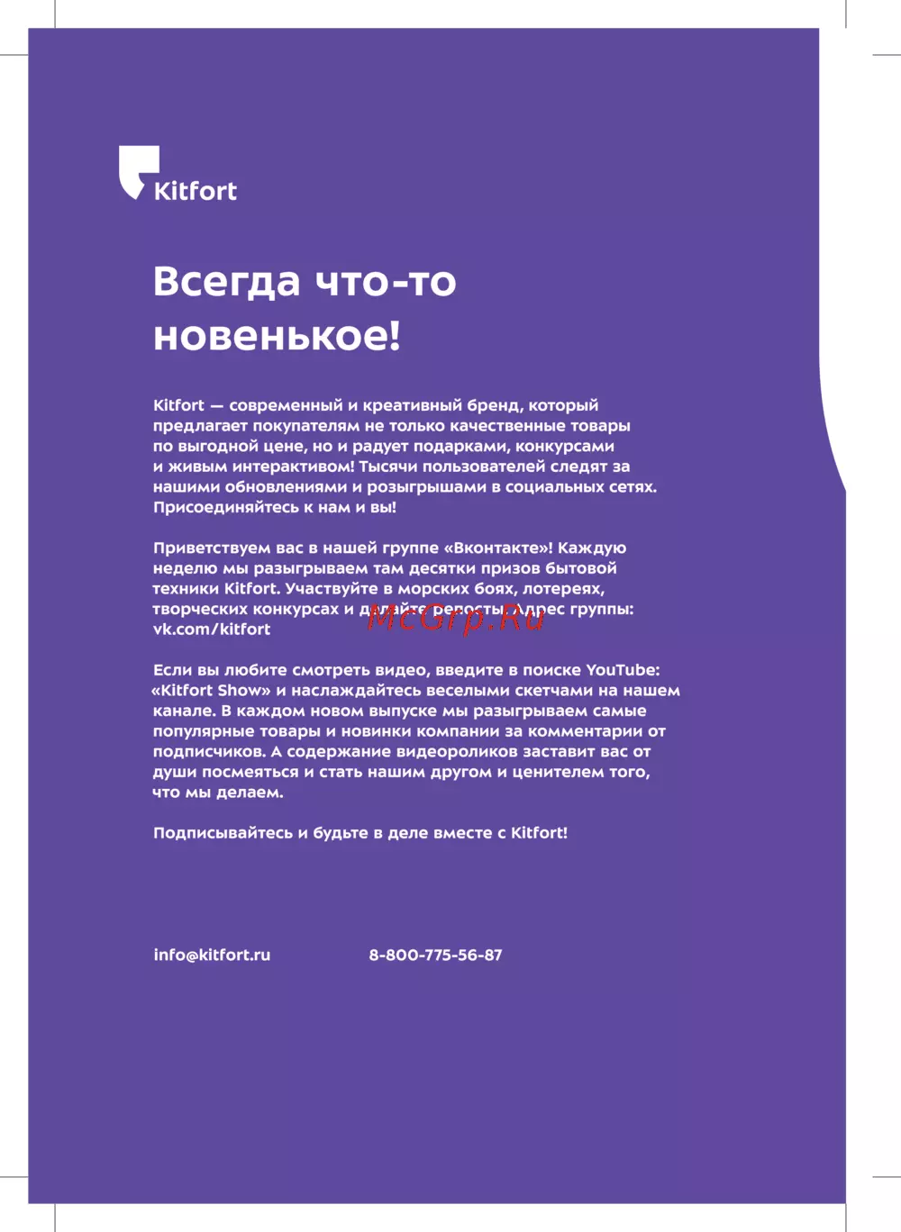 Kitfort Всегда что то новенькое Kitfort современный и креативный бренд который предлагает покупателям не только качественные товары по выгодной цене но и радует подарками конкурсами и живым интерактивом Тысячи пользователей следят за нашими обновлениями и розыгрышами в социальных сетях Присоединяйтесь к нам и вы Приветствуем вас в нашей группе Вконтакте Каждую неделю мы разыгрываем там десятки призов бытовой техники Kitfort Участвуйте в морских боях лотереях творческих конкурсах и делайте репосты Адрес группы vk com kitfort Если вы любите смотреть видео введите в поиске YouTube Kitfort Show и наслаждайтесь веселыми скетчами на нашем канале В каждом новом выпуске мы разыгрываем самые популярные товары и новинки компании за комментарии от подписчиков А содержание видеороликов заставит вас от души посмеяться и стать нашим другом и ценителем того что мы делаем Подписывайтесь и будьте в деле вместе с Kitfort info kitfort ru 8 800 775 56 87