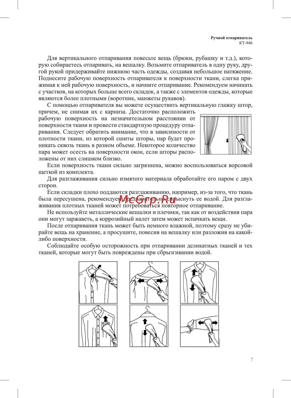 Ручной отпариватель КТ 946 Для вертикального отпаривания повесьте вещь брюки рубашку и т д кото рую собираетесь отпаривать на вешалку Возьмите отпариватель в одну руку дру гой рукой придерживайте нижнюю часть одежды создавая небольшое натяжение Поднесите рабочую поверхность отпаривателя к поверхности ткани слегка при жимая к ней рабочую поверхность и начните отпаривание Рекомендуем начинать с участков на которых больше всего складок а также с элементов одежды которые являются более плотными воротник манжеты рукавов С помощью отпаривателя вы можете осуществить вертикальную глажку штор причем не снимая их с карниза Достаточно расположить рабочую поверхность на незначительном расстоянии от поверхности ткани и провести стандартную процедуру отпа ривания Следует обратить внимание что в зависимости от плотности ткани из которой сшиты шторы пар будет про никать сквозь ткань в разном объеме Некоторое количество пара может осесть на поверхности окон если шторы распо ложены от них слишком близко Если поверхность ткани сильно загрязнена можно воспользоваться ворсовой щеткой из комплекта Для разглаживания сильно измятого материала обработайте его паром с двух сторон Если складки плохо поддаются разглаживанию например из за того что ткань была пересушена рекомендуем предварительно спрыснуть ее водой Для разгла живания плотных тканей может потребоваться повторное отпаривание Не используйте металлические вешалки и плечики так как от воздействия пара они могут заржаветь а коррозийный налет затем может испачкать вещи После отпаривания ткань может быть немного влажной поэтому сразу не уби райте вещь на хранение а просушите повесив на вешалку или разложив на какойлибо поверхности Соблюдайте особую осторожность при отпаривании деликатных тканей и тех тканей которые могут быть повреждены при сбрызгивании водой 7