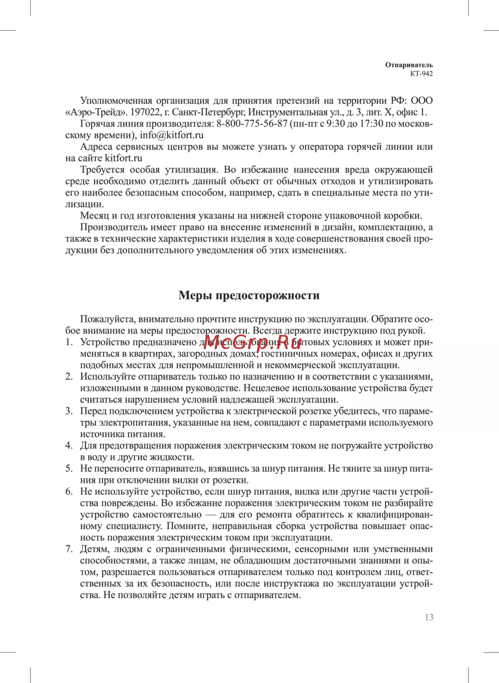 Отпариватель КТ 942 Уполномоченная организация для принятия претензий на территории РФ ООО Аэро Трейд 197022 г Санкт Петербург Инструментальная ул д 3 лит X офис 1 Горячая линия производителя 8 800 775 56 87 пн пт с 9 30 до 17 30 по москов скому времени info kitfort ru Адреса сервисных центров вы можете узнать у оператора горячей линии или на сайте kitfort ru Требуется особая утилизация Во избежание нанесения вреда окружающей среде необходимо отделить данный объект от обычных отходов и утилизировать его наиболее безопасным способом например сдать в специальные места по ути лизации Месяц и год изготовления указаны на нижней стороне упаковочной коробки Производитель имеет право на внесение изменений в дизайн комплектацию а также в технические характеристики изделия в ходе совершенствования своей про дукции без дополнительного уведомления об этих изменениях Меры предосторожности Пожалуйста внимательно прочтите инструкцию по эксплуатации Обратите осо бое внимание на меры предосторожности Всегда держите инструкцию под рукой 1 Устройство предназначено для использования в бытовых условиях и может при меняться в квартирах загородных домах гостиничных номерах офисах и других подобных местах для непромышленной и некоммерческой эксплуатации 2 Используйте отпариватель только по назначению и в соответствии с указаниями изложенными в данном руководстве Нецелевое использование устройства будет считаться нарушением условий надлежащей эксплуатации 3 Перед подключением устройства к электрической розетке убедитесь что параме тры электропитания указанные на нем совпадают с параметрами используемого источника питания 4 Для предотвращения поражения электрическим током не погружайте устройство в воду и другие жидкости 5 Не переносите отпариватель взявшись за шнур питания Не тяните за шнур пита ния при отключении вилки от розетки 6 Не используйте устройство если шнур питания вилка или другие части устрой ства повреждены Во избежание поражения электрическим током не разбирайте устройство самостоятельно для его ремонта обратитесь к квалифицирован ному специалисту Помните неправильная сборка устройства повышает опас ность поражения электрическим током при эксплуатации 7 Детям людям с ограниченными физическими сенсорными или умственными способностями а также лицам не обладающим достаточными знаниями и опы том разрешается пользоваться отпаривателем только под контролем лиц ответ ственных за их безопасность или после инструктажа по эксплуатации устрой ства Не позволяйте детям играть с отпаривателем 13