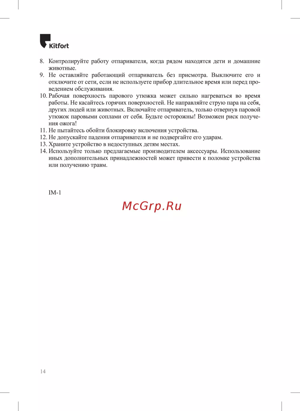 К1ЬРогЬ 8 Контролируйте работу отпаривателя когда рядом находятся дети и домашние животные 9 Не оставляйте работающий отпариватель без присмотра Выключите его и отключите от сети если не используете прибор длительное время или перед про ведением обслуживания 10 Рабочая поверхность парового утюжка может сильно нагреваться во время работы Не касайтесь горячих поверхностей Не направляйте струю пара на себя других людей или животных Включайте отпариватель только отвернув паровой утюжок паровыми соплами от себя Будьте осторожны Возможен риск получе ния ожога 11 Не пытайтесь обойти блокировку включения устройства 12 Не допускайте падения отпаривателя и не подвергайте его ударам 13 Храните устройство в недоступных детям местах 14 Используйте только предлагаемые производителем аксессуары Использование иных дополнительных принадлежностей может привести к поломке устройства или получению травм 1М 1 14