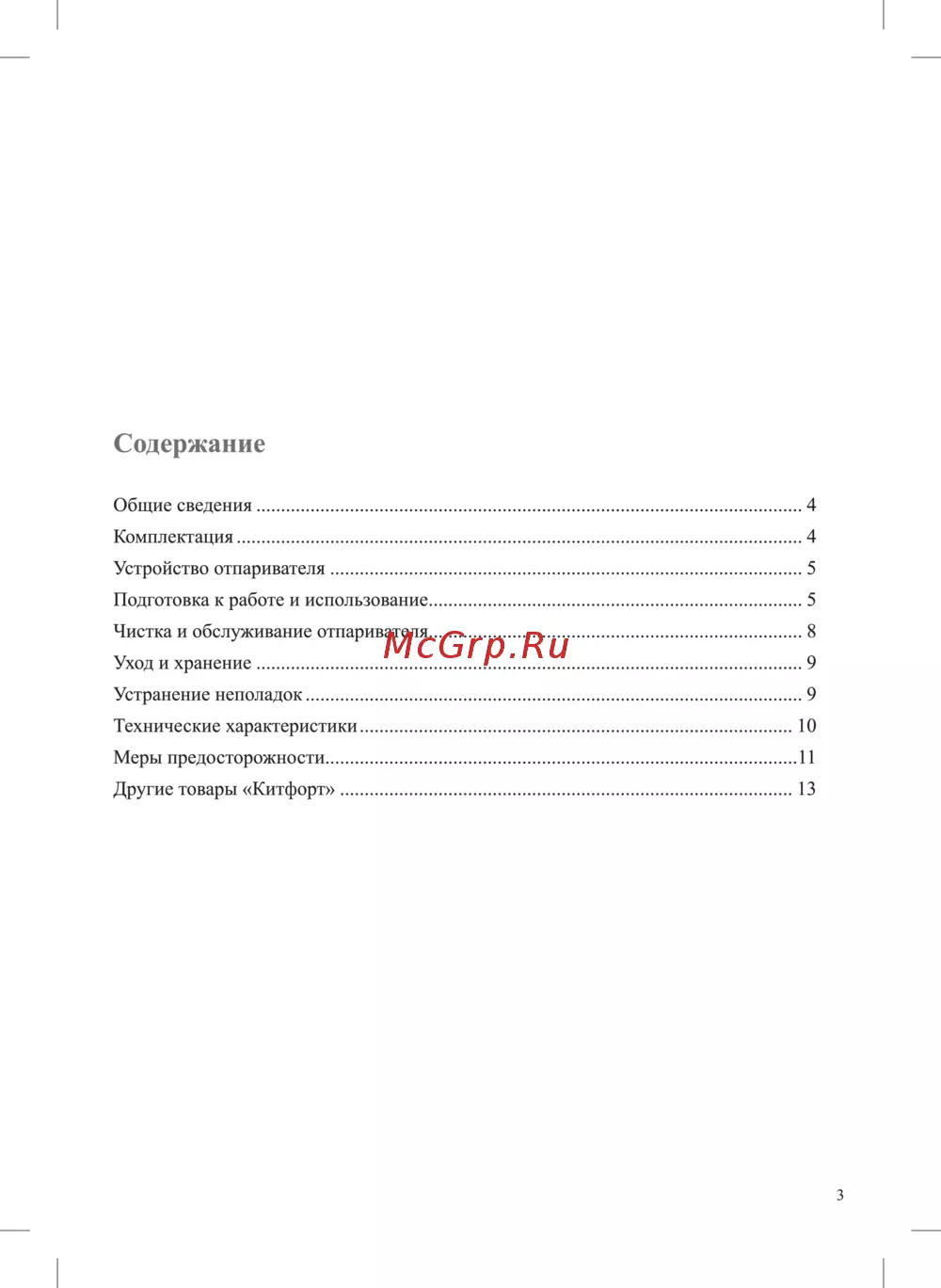Содержание Общие сведения 4 Комплектация 4 Устройство отпаривателя 5 Подготовка к работе и использование 5 Чистка и обслуживание отпаривателя 8 Уход и хранение 9 Устранение неполадок 9 Технические характеристики 10 Меры предосторожности 11 Другие товары Китфорт 13 з