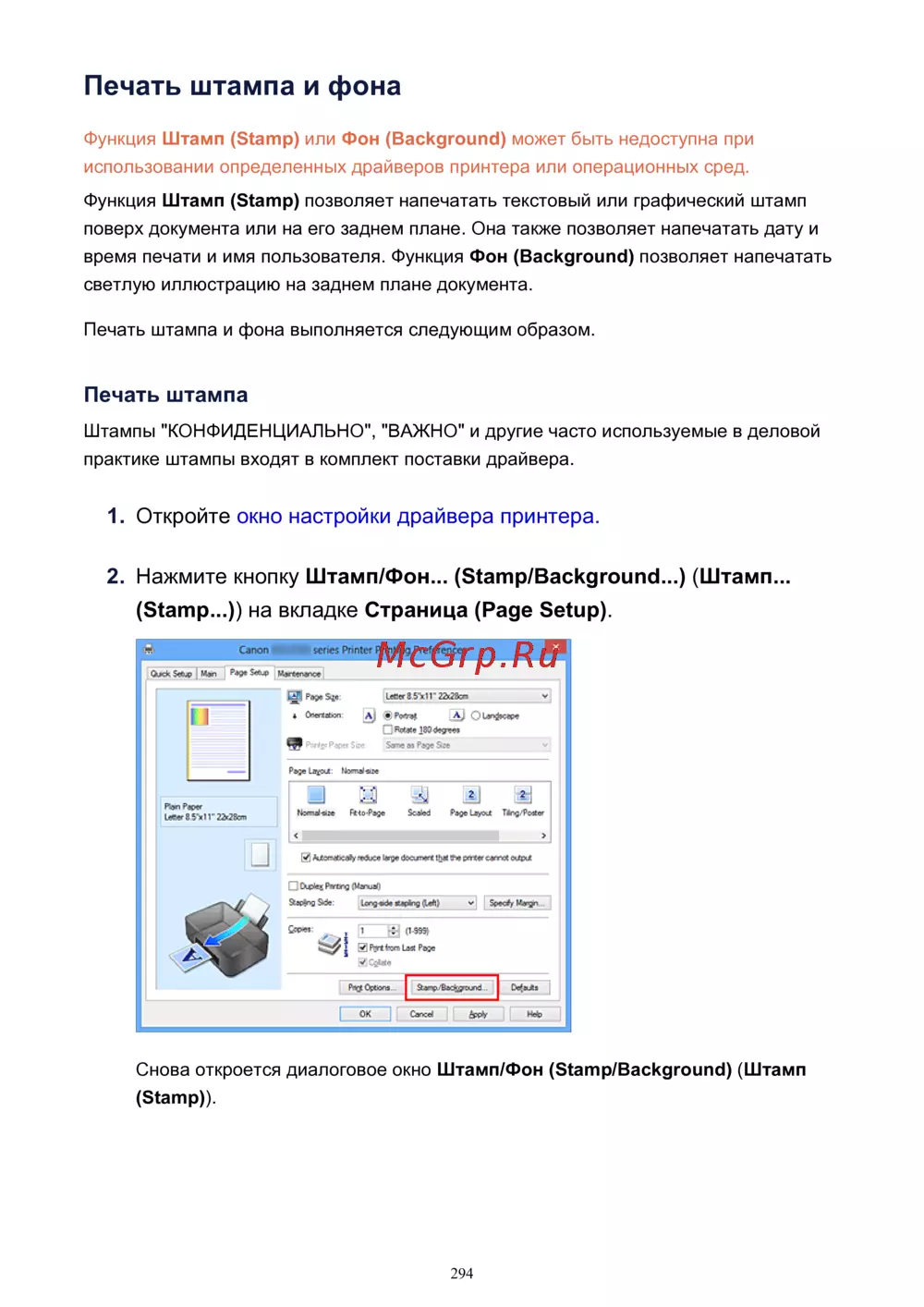 Canon PIXMA MG2545 — как использовать функции печати штампов и фонов в документах [294/638]