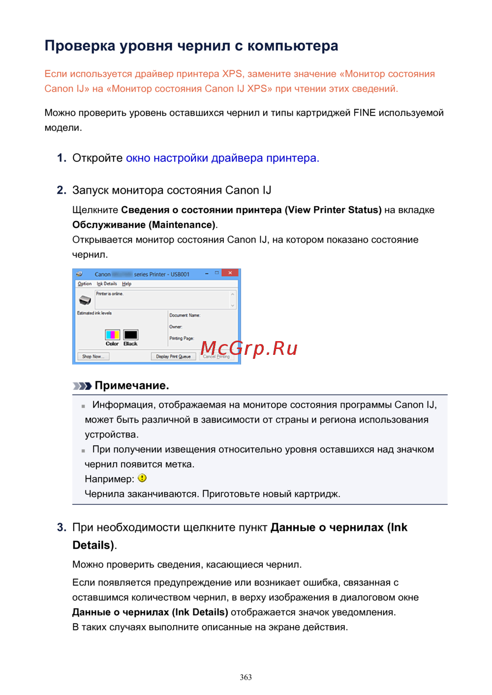Canon IJ» на «Монитор состояния Canon IJ XPS» при чтении этих сведений.