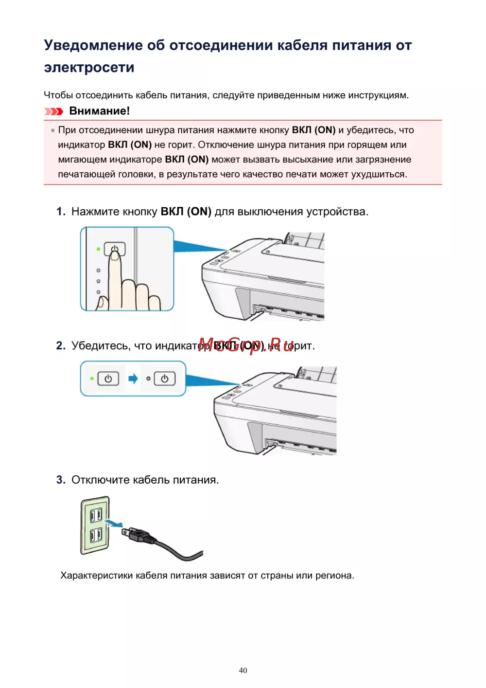 Canon PIXMA MG2545 — инструкция по отсоединению кабеля питания от электросети [40/638]