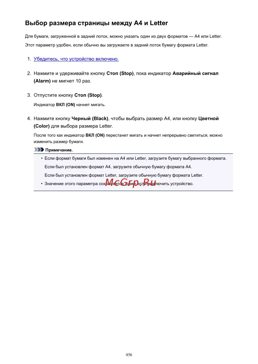 Для бумаги, загруженной в задний лоток, можно указать один из двух форматов — A4 или Letter.
