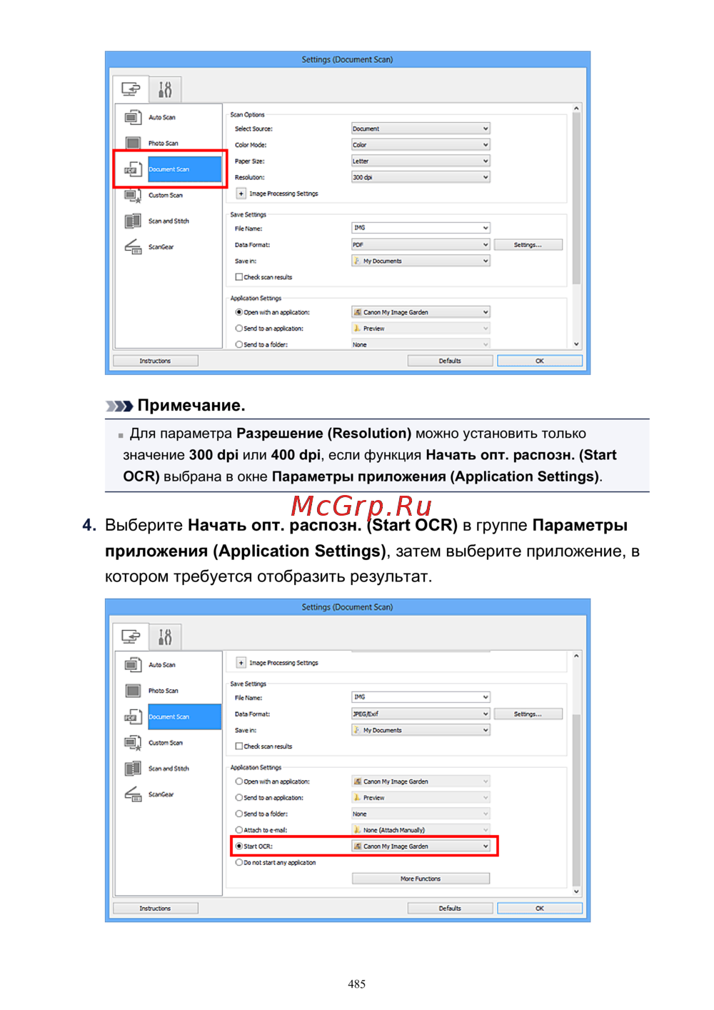 - Если отсканированное изображение будет печататься с увеличением сканируйте с более высоким разрешением чем рекомендовано выше p.625