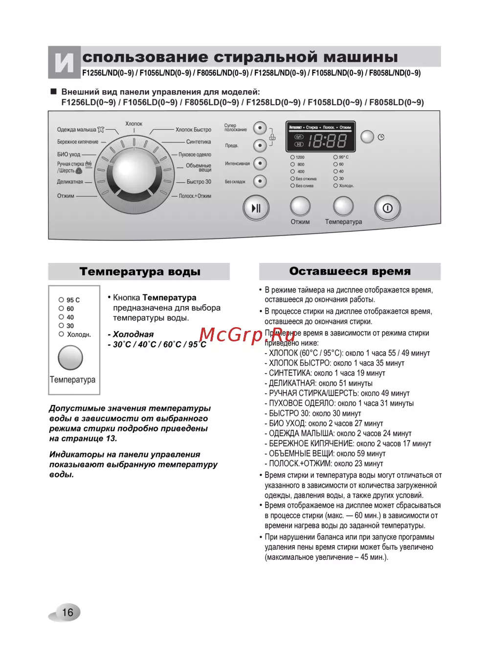 спользование стиральной машины Р12561_ М0 0 9 Р10561_ МО 0 9 Р80561_ МО 0 9 Р1258к МО 0 9 Р10581_ М0 0 9 Р8 0 581_ М0 0 9 Внешний вид панели управления для моделей Р1256к0 0 9 Р1056к0 0 9 Р8056к0 0 9 Р1258к0 0 9 Р1058к0 0 9 Р8058к0 0 9 Температура воды Оставшееся время В режиме таймера на дисплее отображается время О 95 С Кнопка Температура О 60 предназначена для выбора О 40 температуры воды О 30 О Холоди О Холодная ЗО С 40 С 60 С 95 С Температура оставшееся до окончания работы В процессе стирки на дисплее отображается время оставшееся до окончания стирки Примерное время в зависимости от режима стирки приведено ниже ХЛОПОК 60 С 95 С около 1 часа55 49минут ХЛОПОК БЫСТРО около 1 часа 35 минут СИНТЕТИКА около 1 часа 19 минут ДЕЛИКАТНАЯ около 51 минуты РУЧНАЯ СТИРКА ШЕРСТЬ около 49 минут Допустимые значения температуры воды в зависимости от выбранного режима стирки подробно приведены на странице 13 Индикаторы на панели управления показывают выбранную температуру воды ПУХОВОЕ ОДЕЯЛО около 1 часа 31 минуты БЫСТРО 30 около 30 минут БИО УХОД около 2 часов 27 минут ОДЕЖДА МАЛЫША около 2 часов 24 минут БЕРЕЖНОЕ КИПЯЧЕНИЕ около 2 часов 17 минут ОБЪЕМНЫЕ ВЕЩИ около59минут ПОЛОСК ОТЖИМ около 23 минут Время стирки и температура воды могут отличаться от указанного в зависимости от количества загруженной одежды давления воды а также других условий Время отображаемое на дисплее может сбрасываться в процессе стирки макс 60 мин в зависимости от времени нагрева воды до заданной температуры При нарушении баланса или при запуске программы удаления пены время стирки может быть увеличено максимальное увеличение 45 мин 16