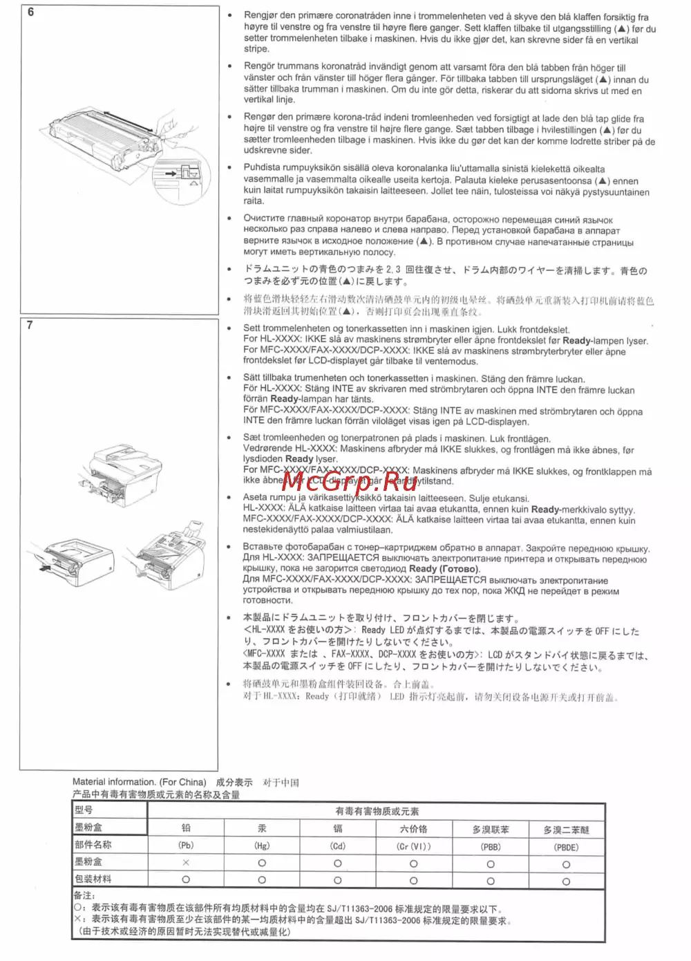 Rengjor den primære coronatraden inne i trommelenheten ved ä skyve den blá klaffen forsiktig fra heyre til venstre og fra venstre til heyre fiere ganger Sett klaffen tilbake til utgangsstilling A for du setter trommelenheten tilbake i maskinen Hvis du ikke gjor det kan skrevne sider fa en vertikal stripe Rengör trummans koronatrad invändigt genom att varsamt föra den bla tabben frán höger till vänster och frän vänster till höger fiera ganger För tillbaka tabben till ursprungsläget A innan du satter tillbaka trumman i maskinen Om du inte gör detta riskerar du att sidorna skrivs ut med en vertikal linje Rengor den primære korona trád indeni tromleenheden ved forsigtigt at lade den bla tap glide fra hojre til venstre og fra venstre til hojre fiere gange Sæt tabben tilbage i hvilestillingen A for du sætter tromleenheden tilbage i maskinen Hvis ikke du gor det kan der komme lodrette striber pa de udskrevne sider Puhdista rumpuyksikön sisällä oleva koronalanka liu uttamalla sinistä kielekettä oikealta vasemmalle ja vasemmalta oikealle useita kertoja Palauta kieleke perusasentoonsa A ennen kuin laitat rumpuyksikön takaisin laitteeseen Joliet tee näin tulosteissa voi näkyä pystysuuntainen raita Очистите главный коронатор внутри барабана осторожно перемещая синий язычок несколько раз справа налево и слева направо Перед установкой барабана в аппарат верните язычок в исходное положение А В противном случае напечатанные страницы могут иметь вертикальную полосу 2 3 E lW WOLÍt W 1 1 Vdïi îïnfWvi т ЙIÏJ Шill W MMФ ÆOrlit M1 IM ЙМ II ЙО ï A J HJ ÚI Ol Д1 i l L m üÊ Sett trommelenheten og tonerkassetten inn i maskinen igjen Lukk frontdekslet For HL XXXX IKKE slà av maskinens strombryter eller àpne frontdekslet for Ready lampen lyser For MFC XXXX FAX XXXX DCP XXXX IKKE sla av maskinens strombryterbryter eller àpne frontdekslet for LCD displayet gar tilbake til ventemodus Satt tillbaka trumenheten och tonerkassetten i maskinen Stang den främre luckan För HL XXXX Stäng INTE av skrivaren med strömbrytaren och öppna INTE den främre luckan förrän Ready Iampan har tänts För MFC XXXX FAX XXXX DCP XXXX Stäng INTE av maskinen med strömbrytaren och öppna INTE den främre luckan förrän viloläget visas igen pa LCD displayen Sæt tromleenheden og tonerpatronen pa plads i maskinen Luk frontlagen Vedrorende HL XXXX Maskinens afbryder mä IKKE slukkes og frontlägen ma ikke abnes for lysdioden Ready lyser For MFC XXXX FAX XXXX DCP XXXX Maskinens afbryder ma IKKE slukkes og frontklappen ma ikke äbnes for LCD displayet gär I standbytilstand Aseta rumpu ja värikasettiyksikkö takaisin laitteeseen Sulje etukansi HL XXXX ÄLÄ katkaise laitteen virtaa tai avaa etukantta ennen kuin Ready merkkivalo syttyy MFC XXXX FAX XXXX DCP XXXX ÄLÄ katkaise laitteen virtaa tai avaa etukantta ennen kuin nestekidenäyttö palaa valmiustilaan Вставьте фотобарабан с тонер картриджем обратно в аппарат Закройте переднюю крышку Для HL XXXX ЗАПРЕЩАЕТСЯ выключать электропитание принтера и открывать переднюю крышку пока не загорится светодиод Ready Готово Для MFC XXXX FAX XXXX DCP XXXX ЗАПРЕЩАЕТСЯ выключать электропитание устройства и открывать переднюю крышку до тех пор пока ЖКД не перейдет в режим готовности НЕ ХХХХ ЙШ 0Л Ready LED iW У УСУ FrtA ÍIWtxy MFC XXXX FAX XXXX DCP XXXX ЖГОШШ OFF ir Ufey НЛЛ ÉIA 3 0 ri у OFF 1г Ute LCD Ь Ч ШГlä шшадшшо fr ж Г HL XXXX Ready j ft LEI i J X HJ Й ft H И n Material information For China FSWWiWÄÄWSmifl WWW SI ж Pb Hg Cd Cr VI PBB PBDE X O O O O O O O O O O 0 ftií О X ЙÍ SJ T11363 2006 ШЙЁЙИ1Ж1П SJ T11363 2006 lÿMÆlWlî SWÆÆ RM fi R